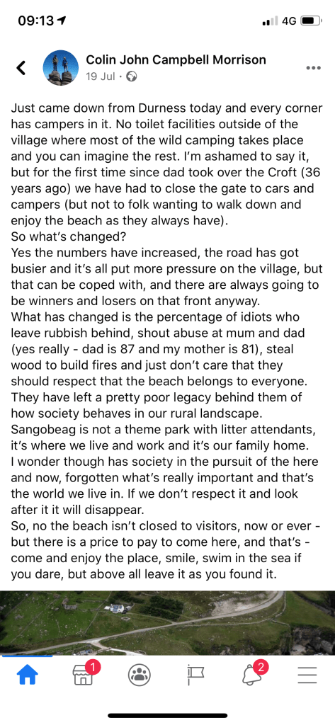 I think there’s a bigger issue that local councils are not geared up to manage the rubbish that staycations are causing. There can be many piles of rubbish around bins which shows that people want to do the right thing but there isn’t the capacity to manage it. I copied this below from a local near Durness. Rather than the emotional anger of some residents, I think he states his case very clearly and succinctly.