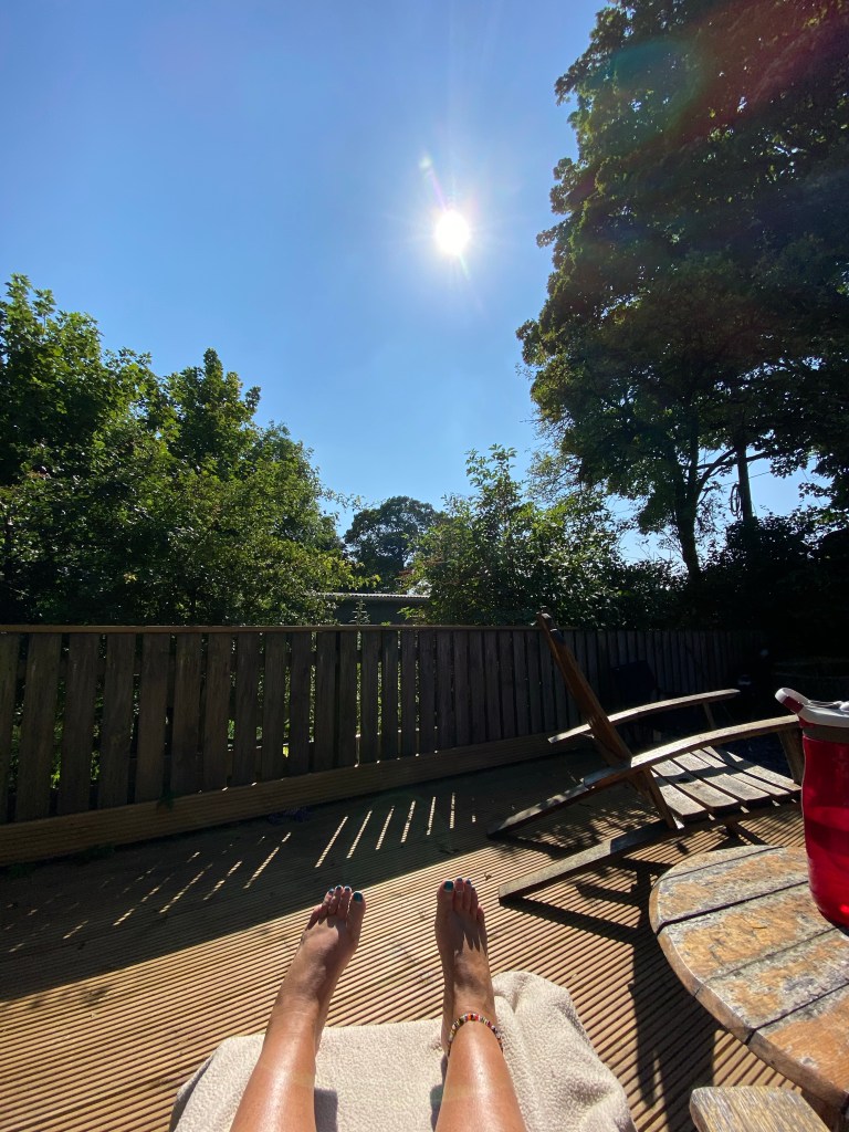 However…. we should currently be on the Isle of Skye in our tent. We are not. The bloody Jeep is leaking fluid which is coming out through the wheels…. guess it really never got put back together properly at the last garage. Abbie the campervan is still getting her body work done so wonāt be ready until 5pm so we are sitting out on our new decking pretending we are abroad, thankfully it is still so hot that we can….