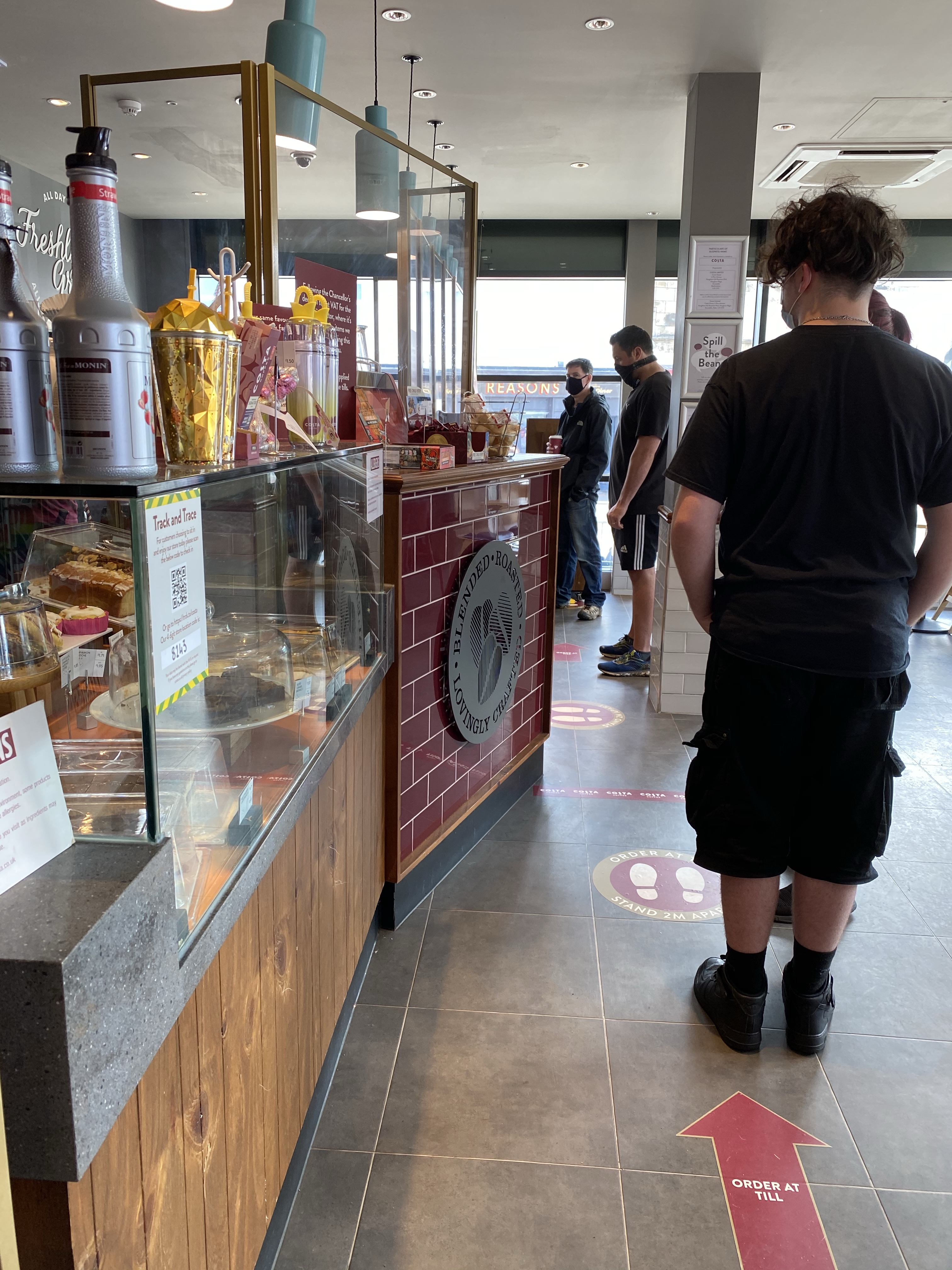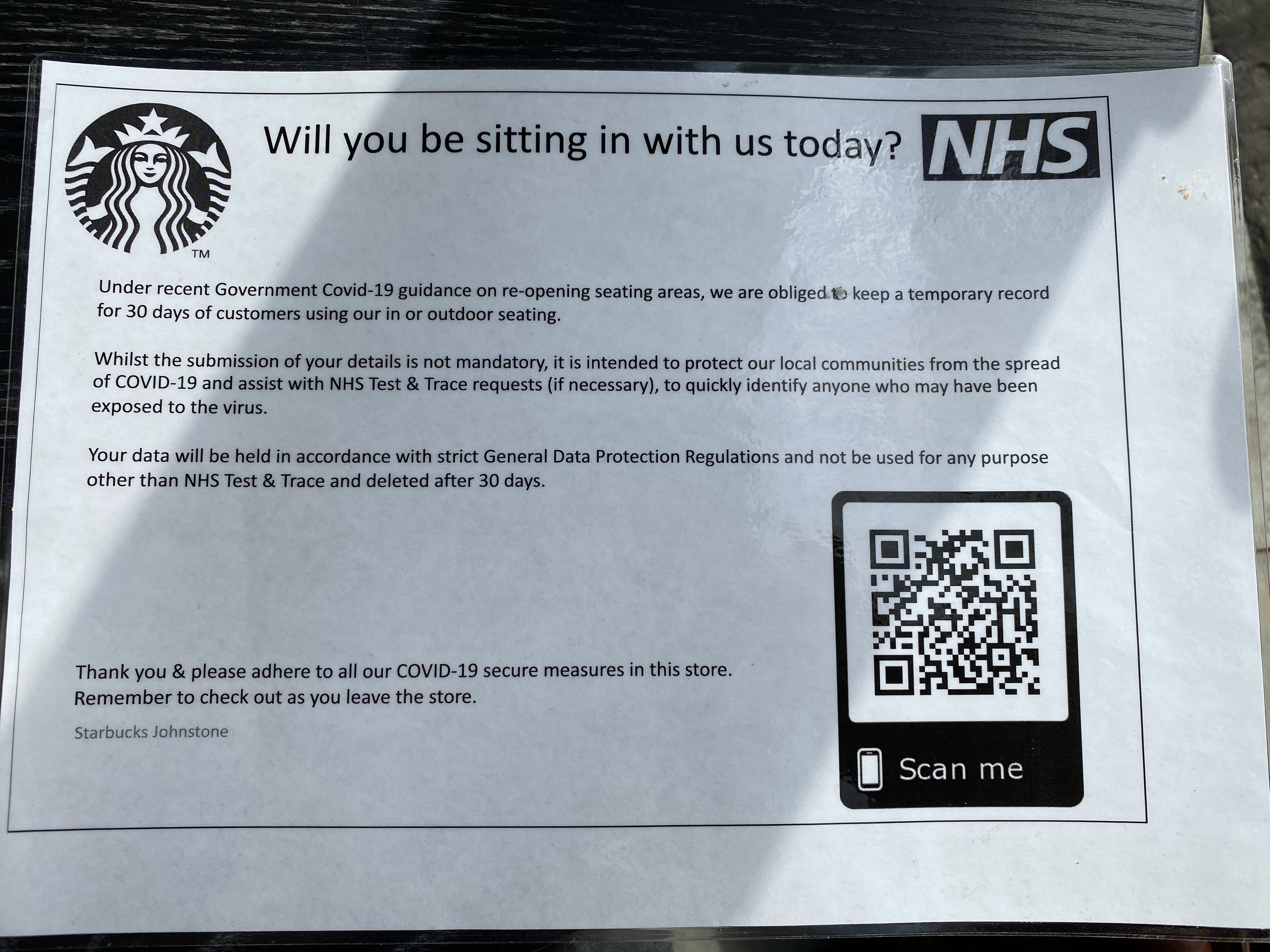 So Starbucks are using a track and trace app to allow them to capture details of their customers. If you are sitting in now they ask you to go and get a table first then go up to buy your coffee, with your mask on. You then go and sit down and they bring it over to you. You only queue if you are taking it away. You then have to adhere to the instructions on the table.