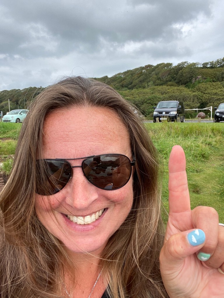 So quiet and still… could have sat there for hours as thereās not a ripple in the sea. Check my beauty camper van but I was also showing you Iād washed my hair šTide right in and so calm Looking north Looking south Wee selfie at the beach We were laughing as there were 2 guys right in our way! The sun is trying to come out but the rains coming too The photo doesnāt do it justiceThen we went to the little coffee caravan for another coffee then Jac went up the road