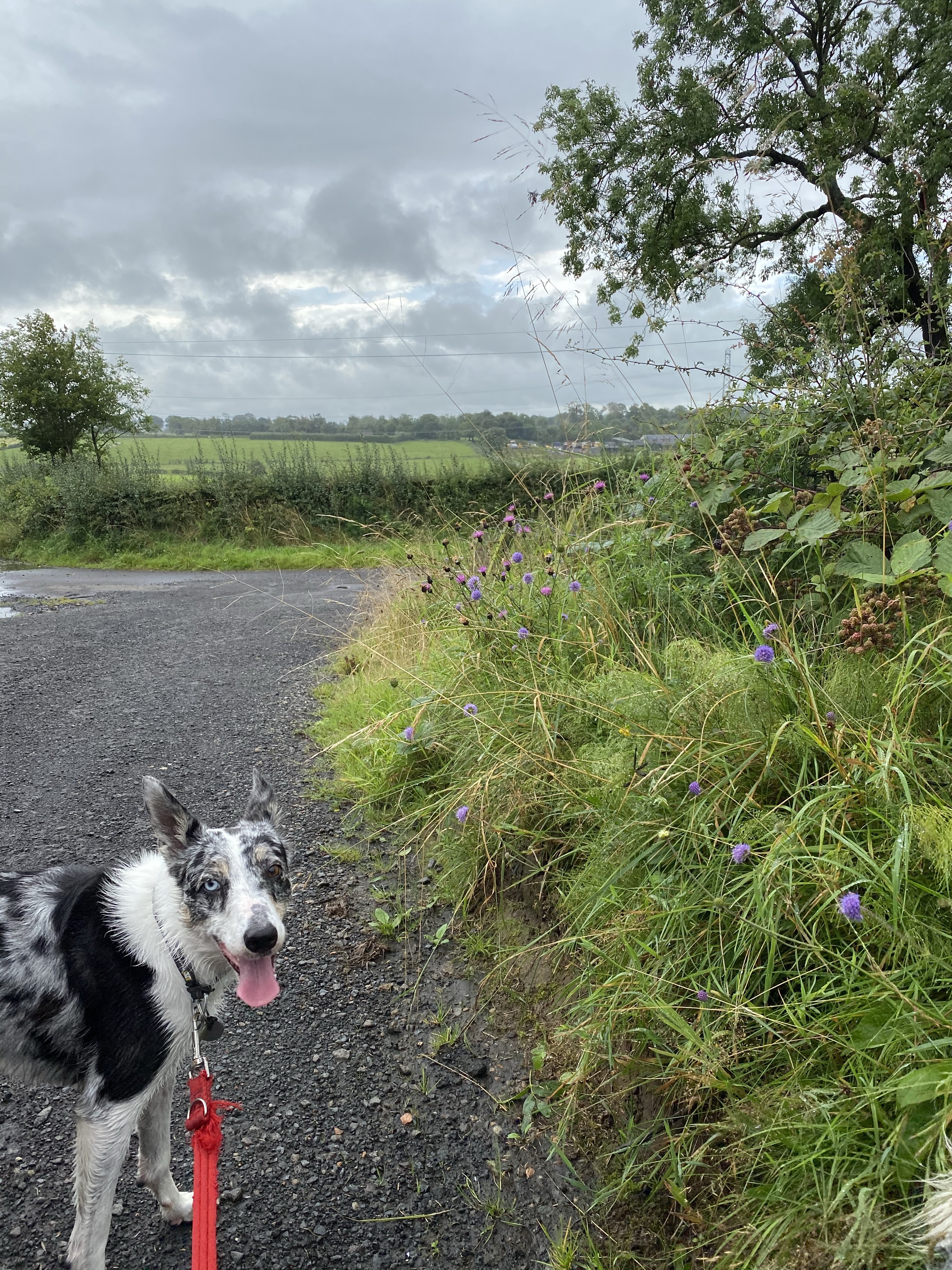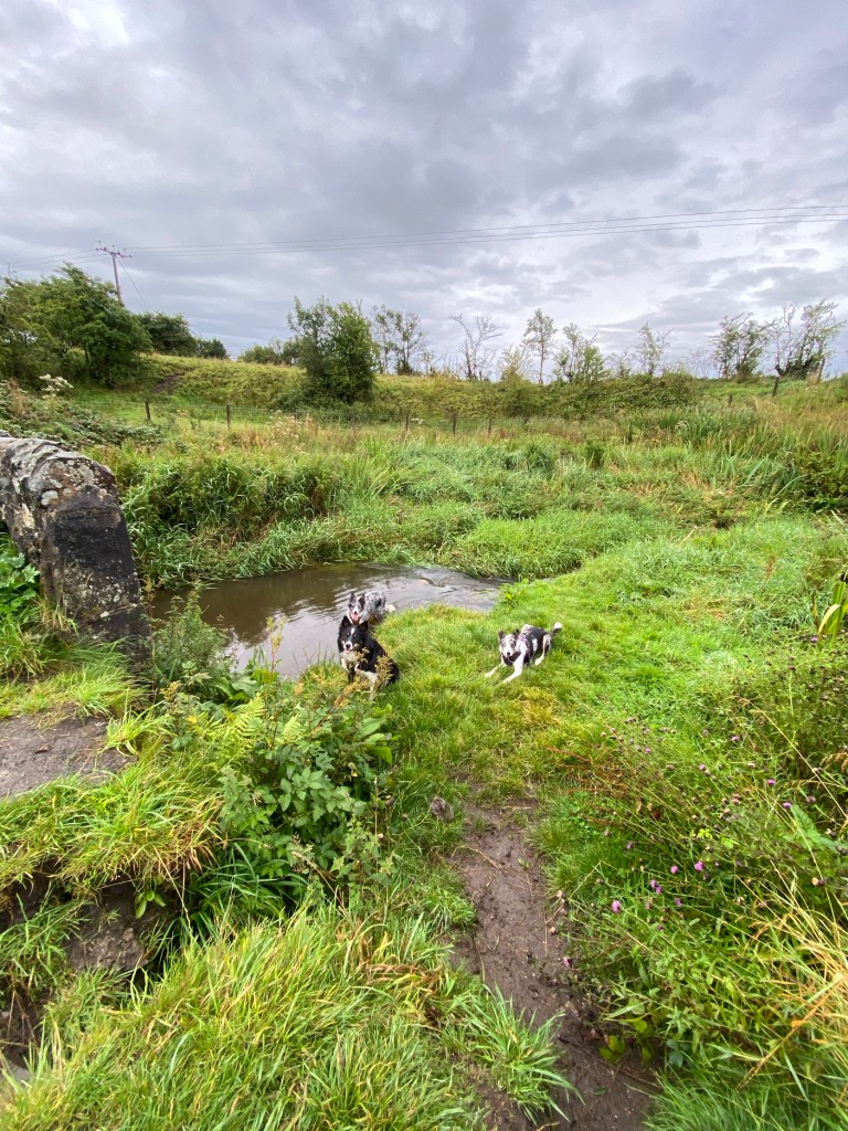 The water levels were really high after yesterdayās rainThe skies were mean and moody (bit like myself!)Love how the pups are sooooo excited to get down to the burn and Calaidh and Freya do very little except watch me. So much fun going nuts to get somewhere only to come back out and onto the lead having done nothing! Bhru thinks the grass tastes niceHomeward bound! Calaidh knew she was being snappedš