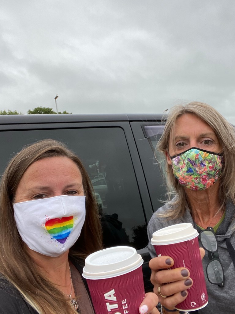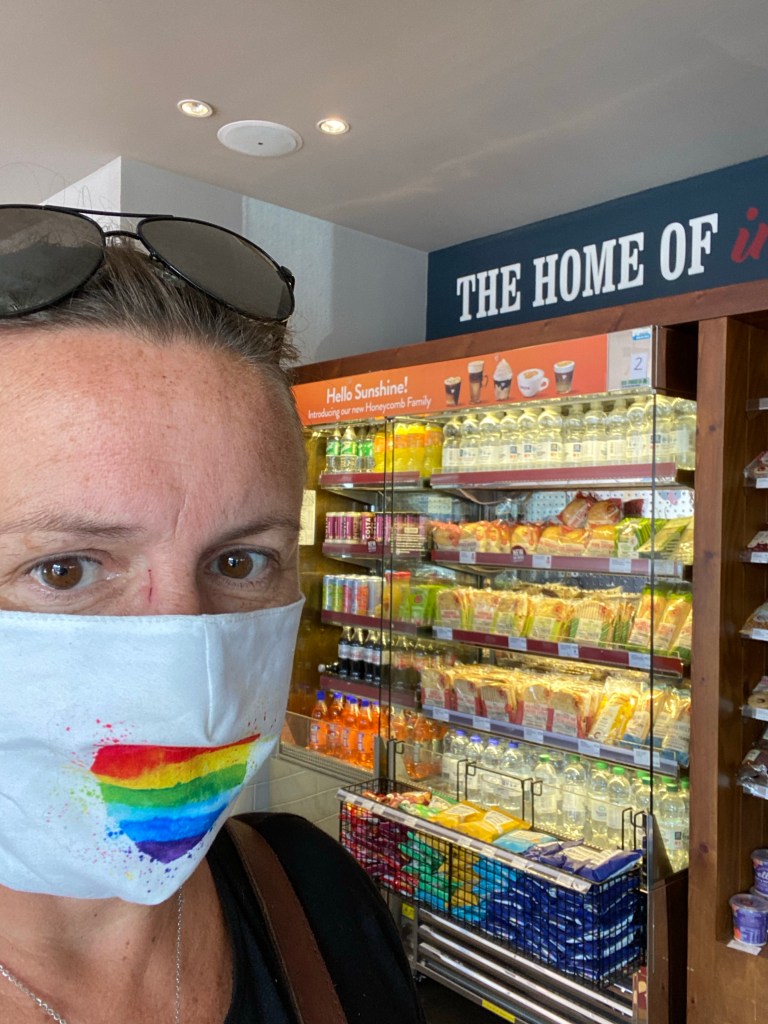 A wee pic of Livingston designer outlet – signs on all the poles saying stay two metres apart. Cafe Nero -Mum got tea and the milk came in the wee espresso cup… too cute not to take a pic and mum is wandering off in the background to look for a napkin!Had to take a mask selfie in the Cadburyās shop!! Brought Craigie a wee cute Cadburyās bag of sweets…. hmmm more for me than him maybe?!? M&S Designer Outlet tills all have screens to separate the customers from the staff serving š·A wee non mask selfie before we headed home