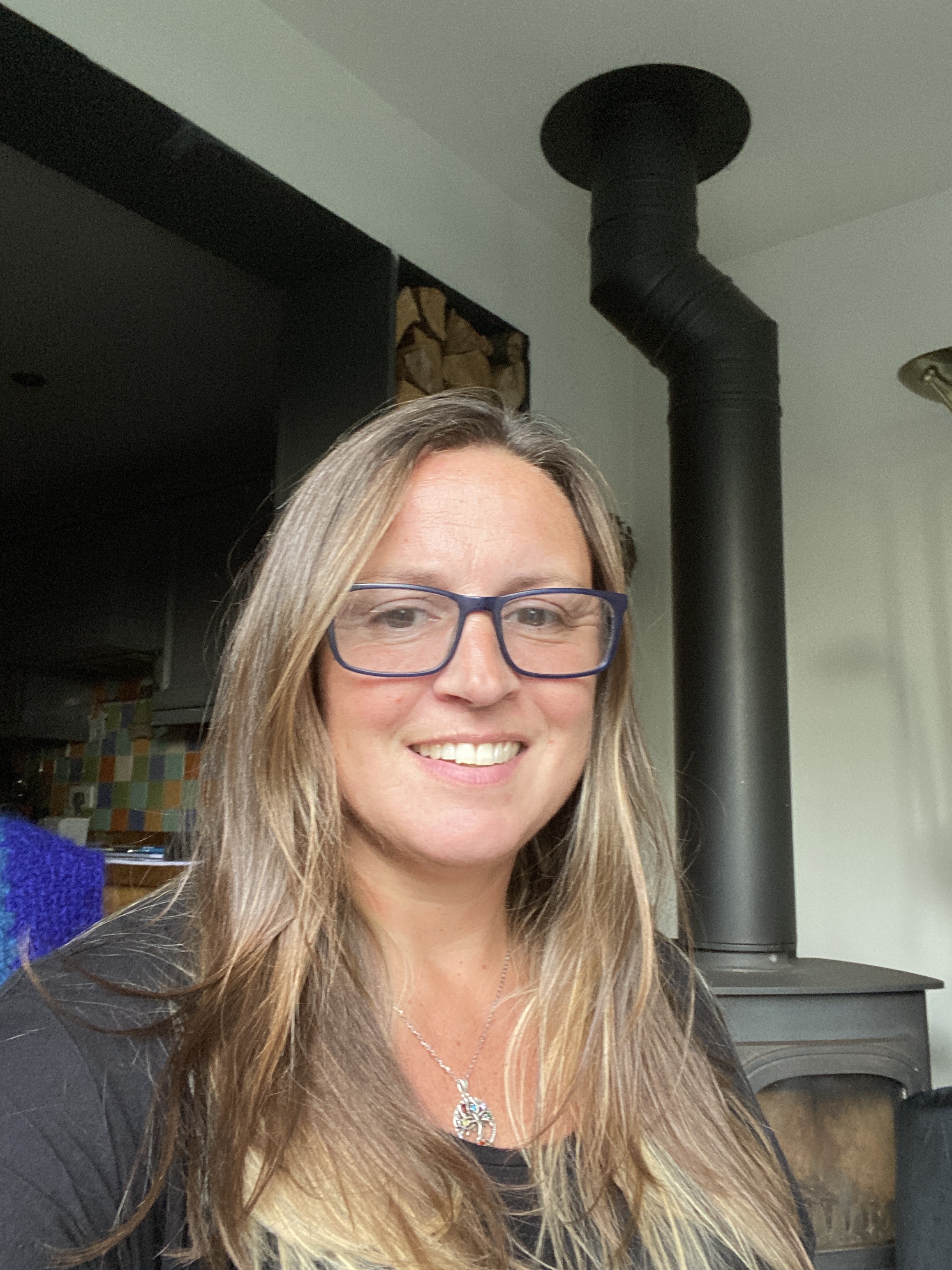 Sitting in Gran’s recliner chair with my feet up (obviously!) next to what we call Nana’s wood burning stove. (Bought with some money when she died.)