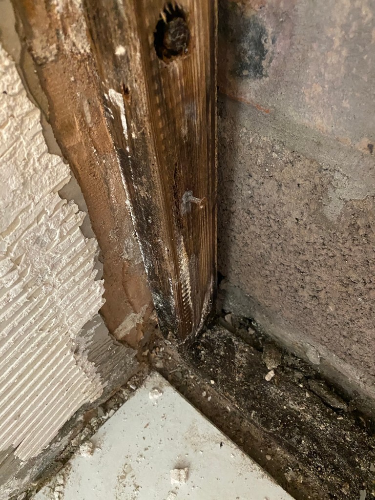 While we were away we were getting the bathroom done but they hit a snag… looks like we are getting water in the back wall of the house as the joists as really wet.