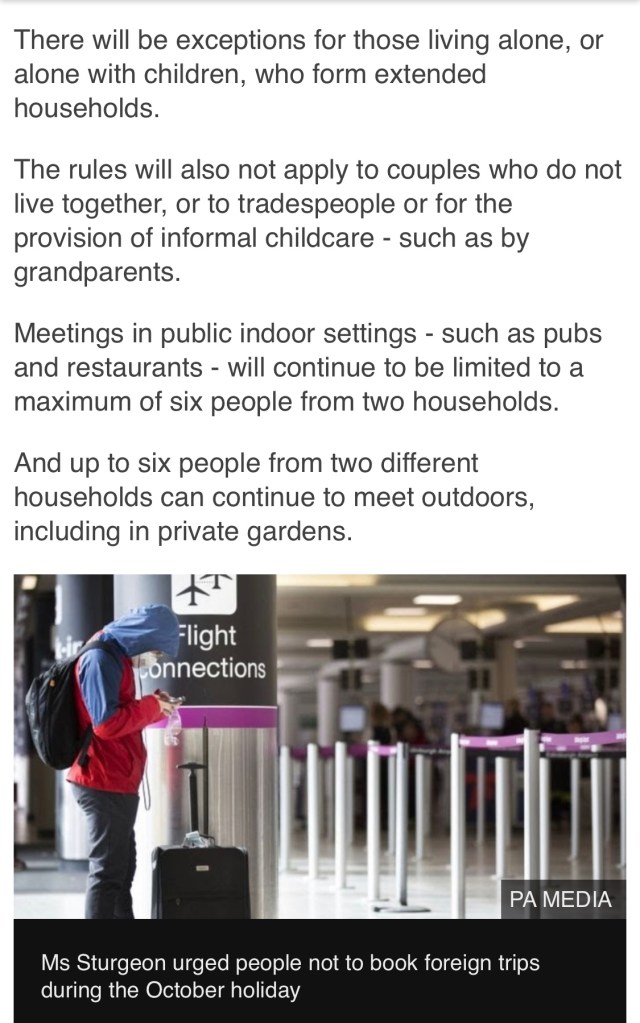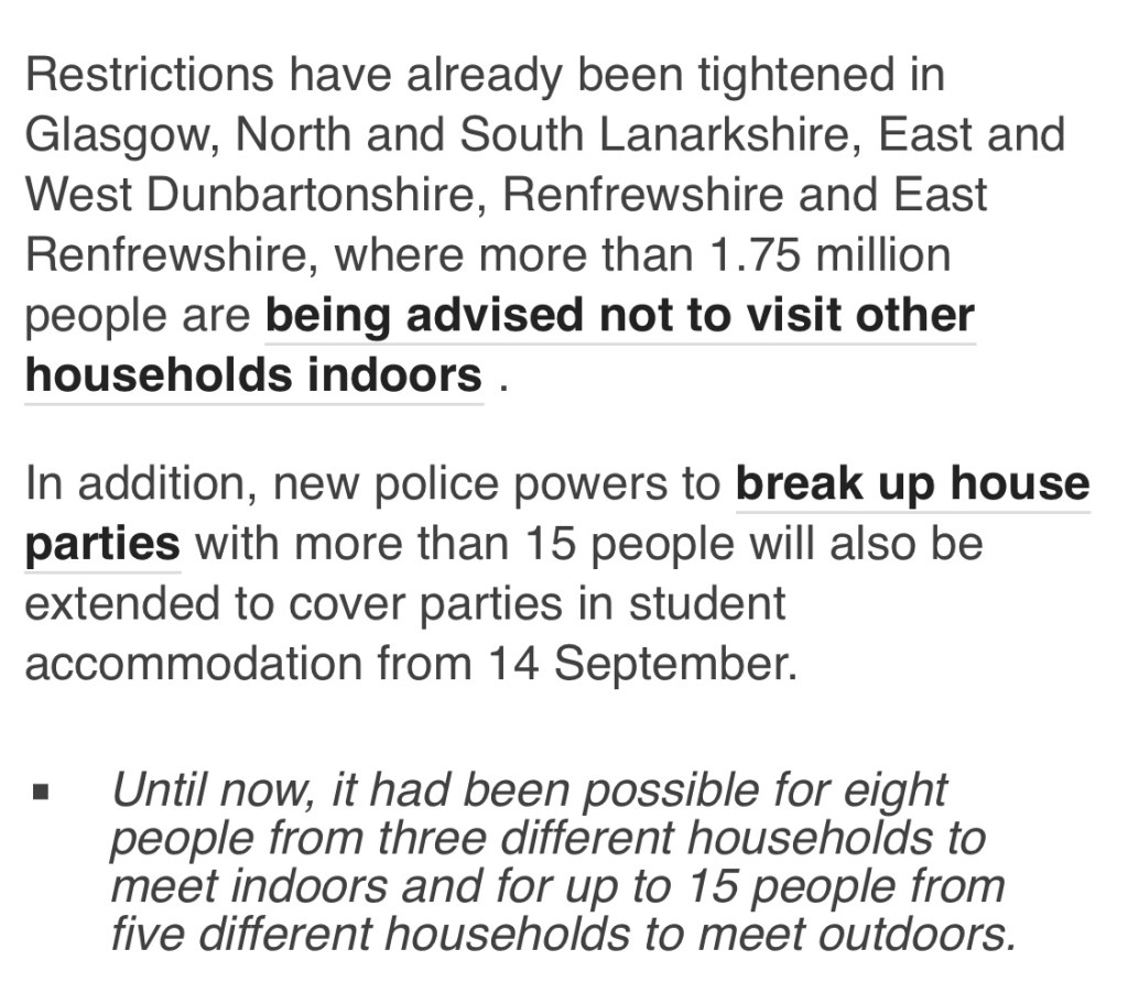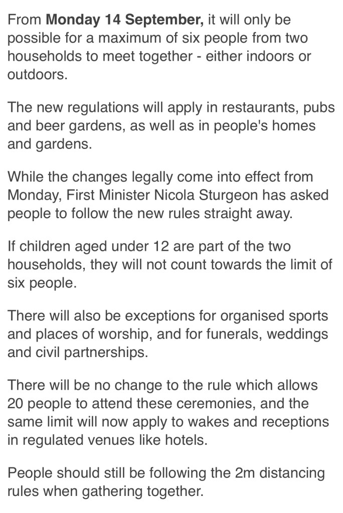 Getting up to speed on the new COVID rules from Monday apparently… only 6 people to meet and from only 2 households. All change again.