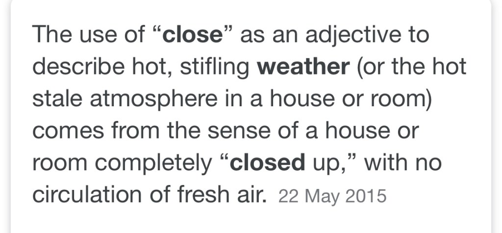 I had to look up the definition of close weather as I write things as I speak it makes me wonder if it’s unique to Scotland or general language.