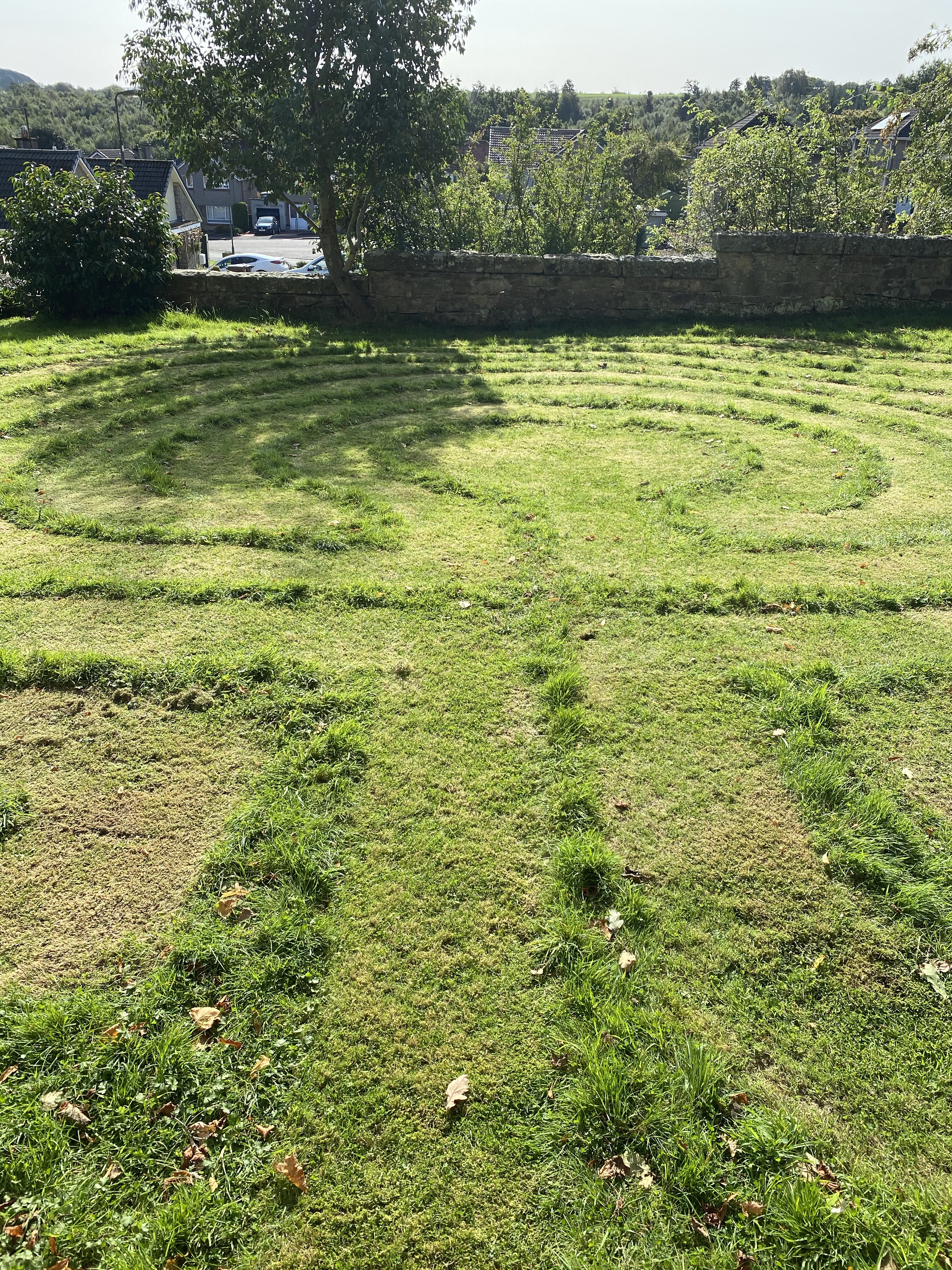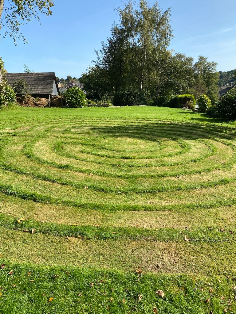 Mum testing against the tower wall while I ran around the Labyrinth It’s designed so that people can walk round in thoughtful contemplation or prayerI of course had to walk round it like a loony to see if it worked!! It did!
