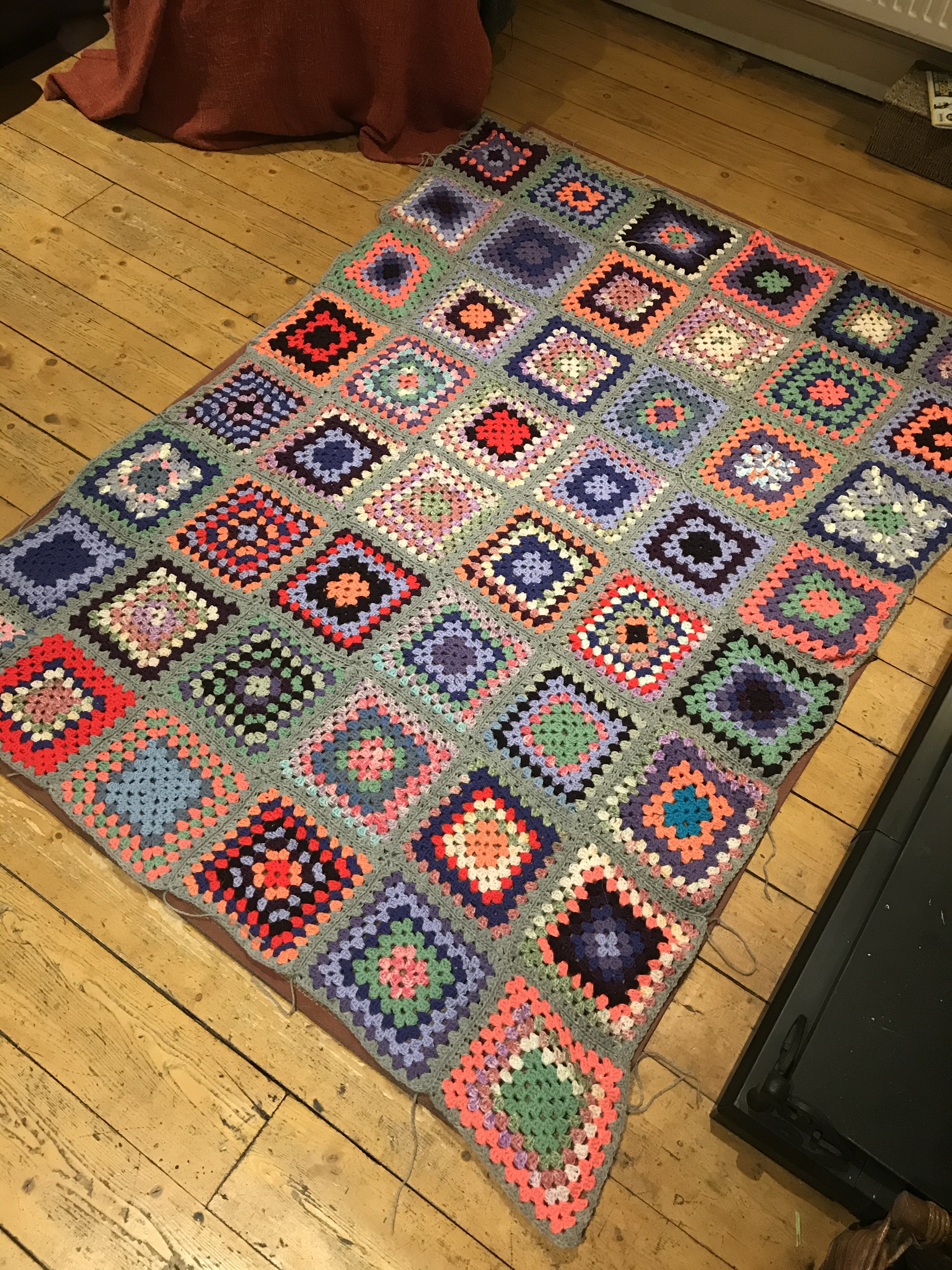 My blanket! A baby blanket for a girl who loved orange 🍊 A horse blanket I was asked to make! 🐴And finally Craig’s blanket…. down on the ground, straightened up and Calaidh lies down with the ball 🎾!!!!!