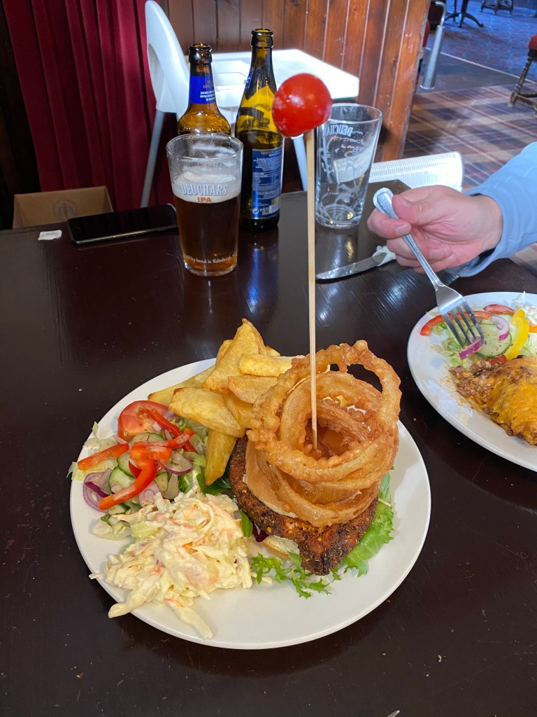Craig polished this bad boy off!!! A Cajun chicken burger with onion rings! It looked even bigger in the flesh.