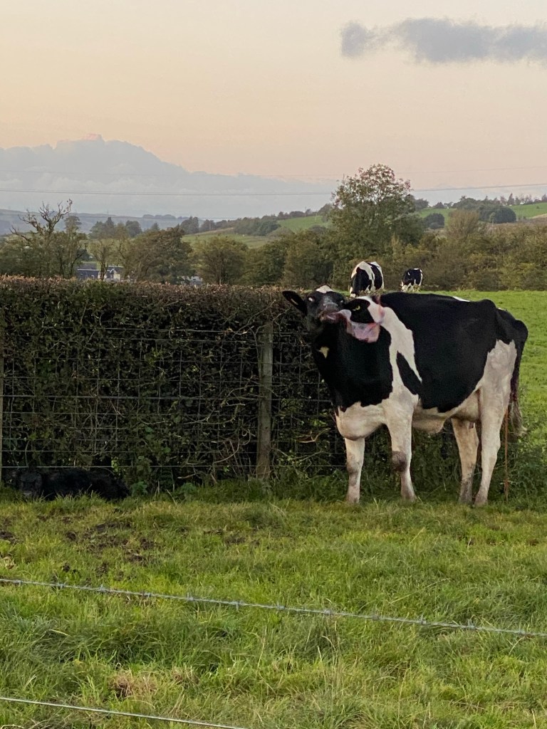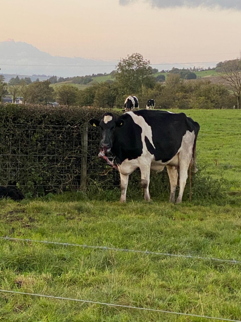 Claire is not a huge fan of cows having been chased by a herd in the past. We walk past a field that is kept for birthing calves. A wee black calf had just been born on our way out… on the way back the cow was eating the afterbirth…. wheeching it about the field as it tried to chew it.