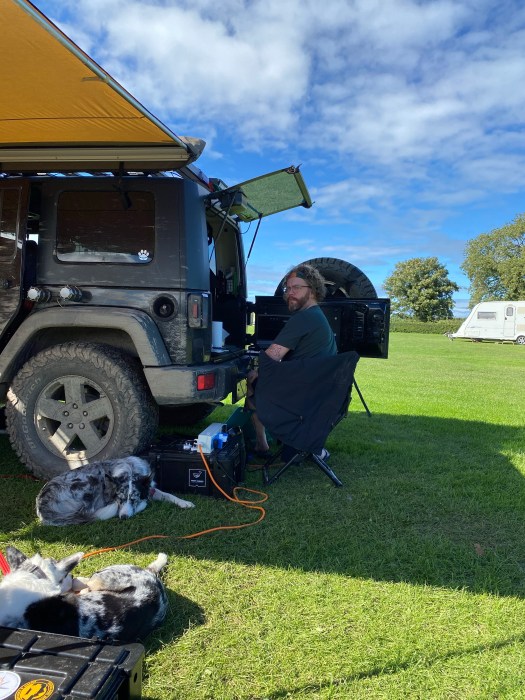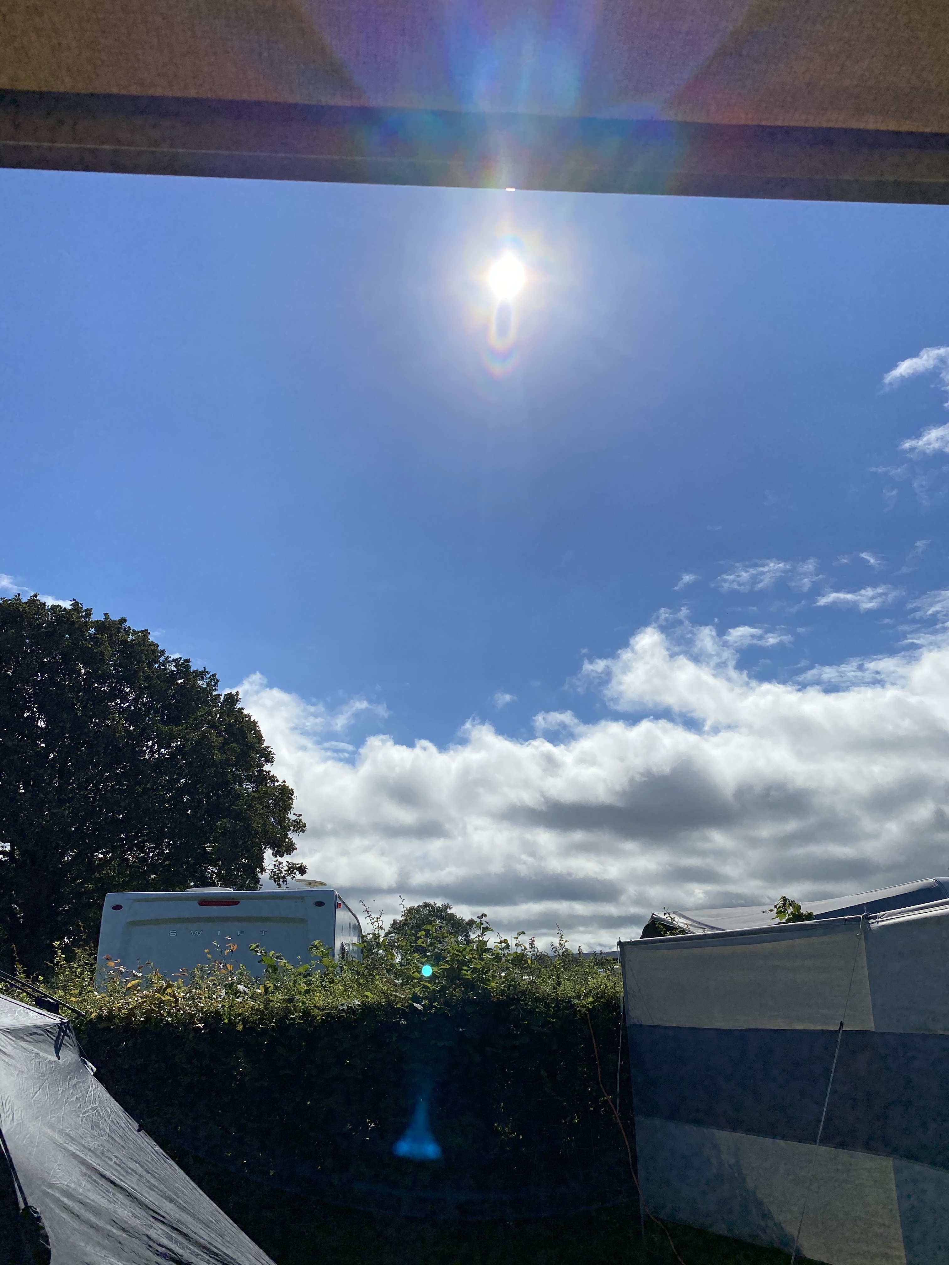 Craig setting everything up inside Pups are happyWe finally sat downThen back up again for dinner! I made a potato curry wrap and Craig had rolls and sausage. The dinner of champions!! Suns out now… lovely Will be heading to find a seat in the sun! 💺 🌞