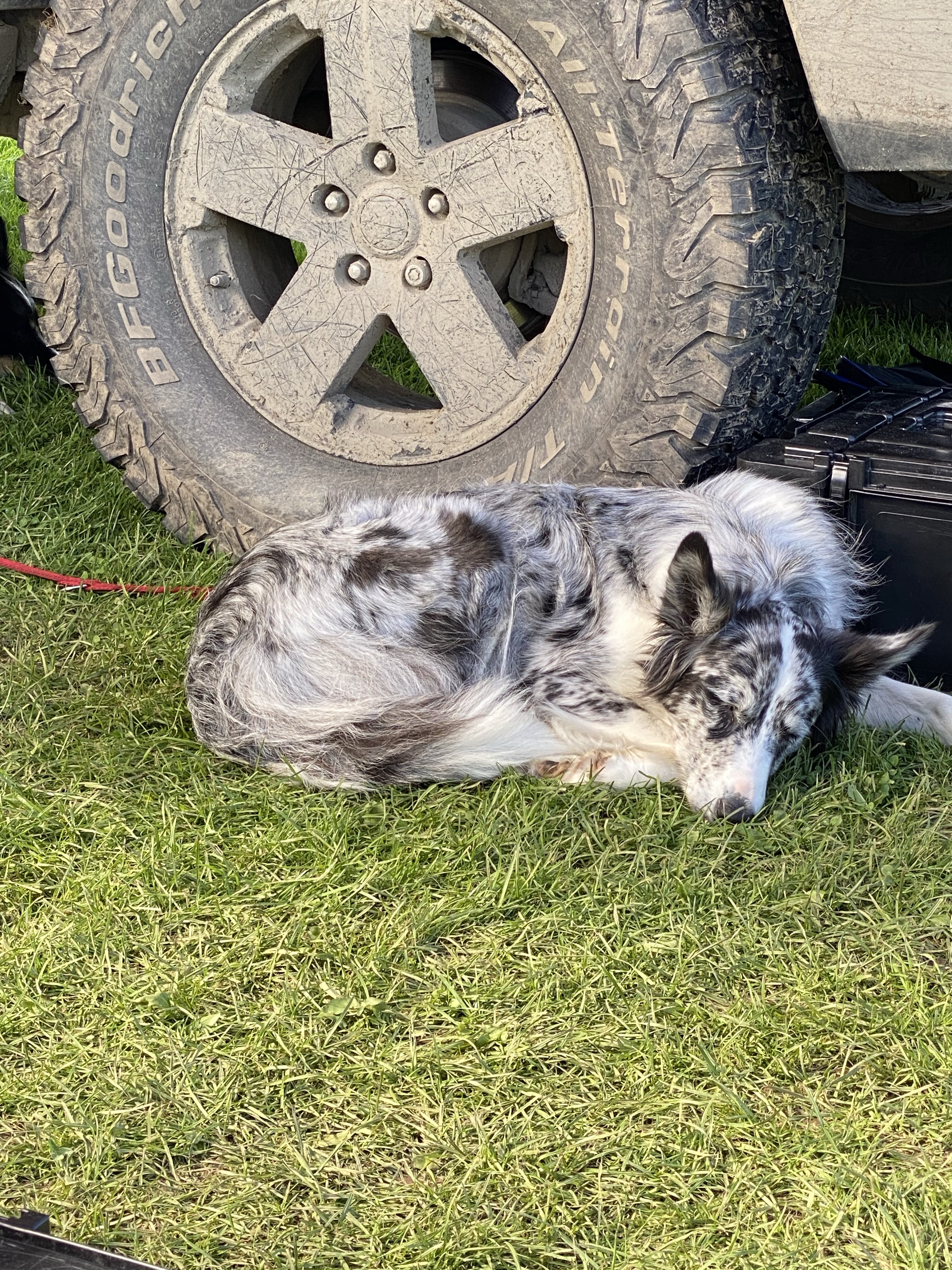 Wee teeny weeny bit windy! 💨 Calaidh managed to find the most uncomfortable 💤 position! Sleepy now! Service station sniff, wee and poseReady to go againMuch nicer weather down here as usual lol 2 hours 7 mins to goJeep reflections