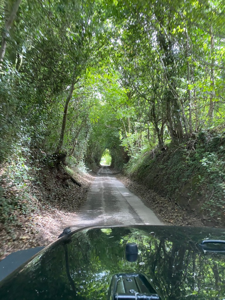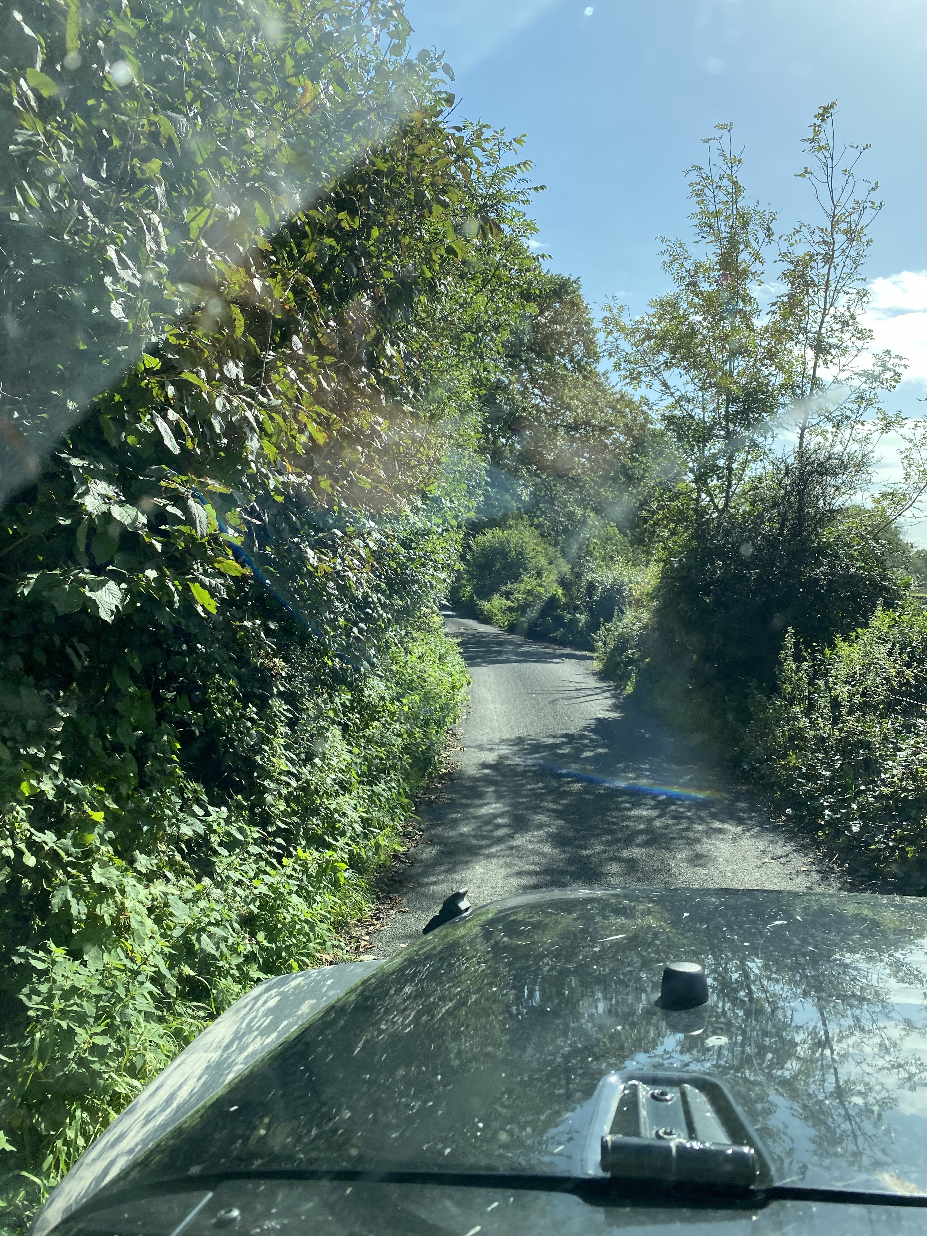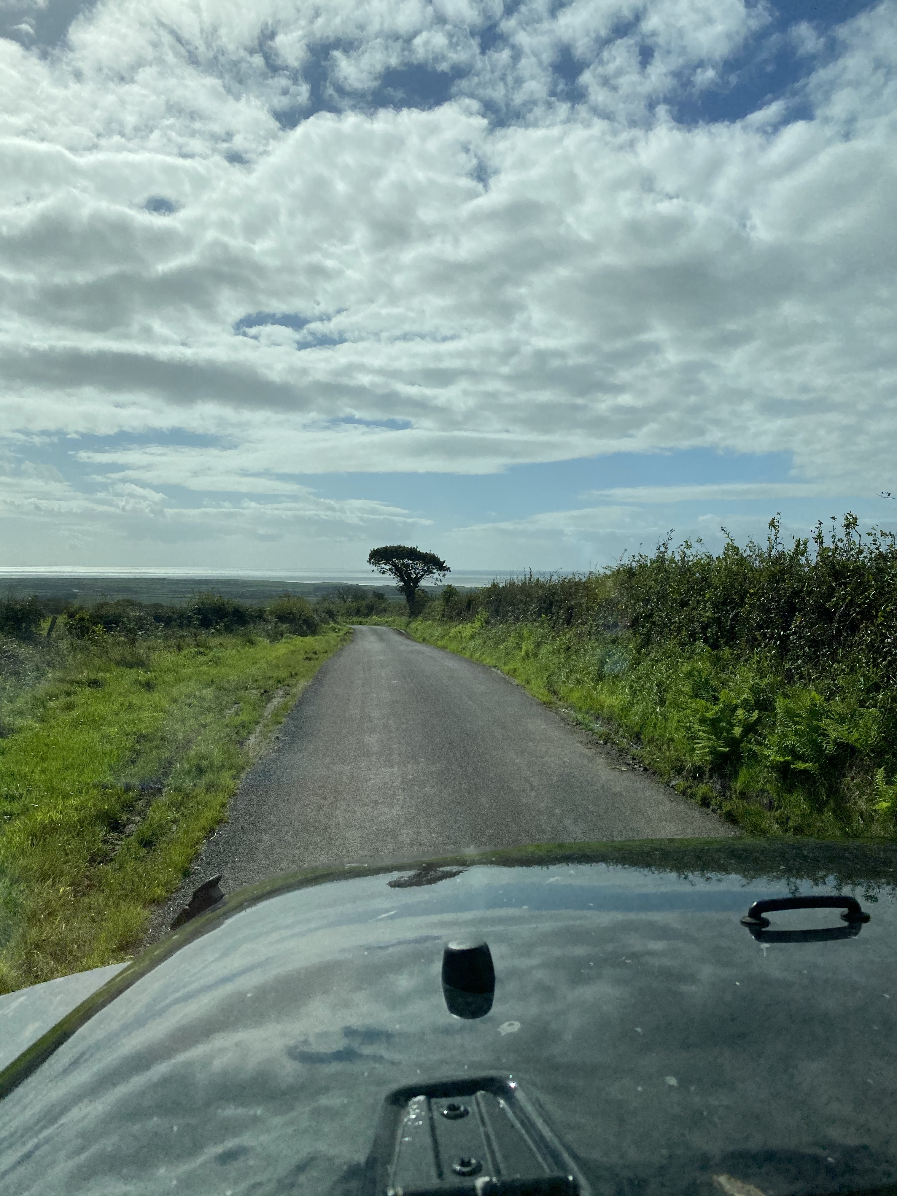 Stunning views Still slowly climbing but no one behind us so we can breathe and take it easy Very blue sheep up here! 🐑 💙Finally the brow of the hill! What a view at the other side, right down to the seaZoomed in Beautiful Ooooh memories of Saturday’s scary lane! Cool tree huh?! Back on a “big” road. Just arrived in Ravenglass Jeepey posing