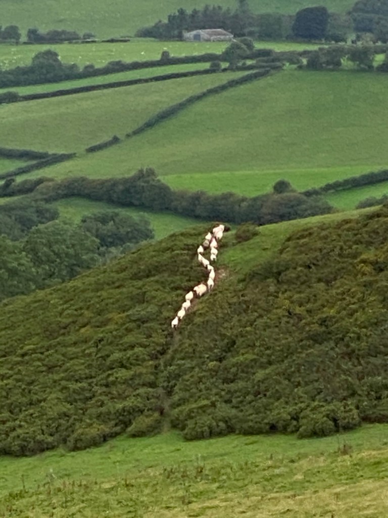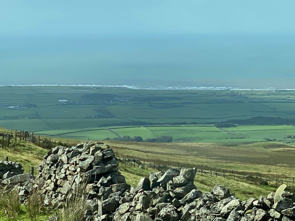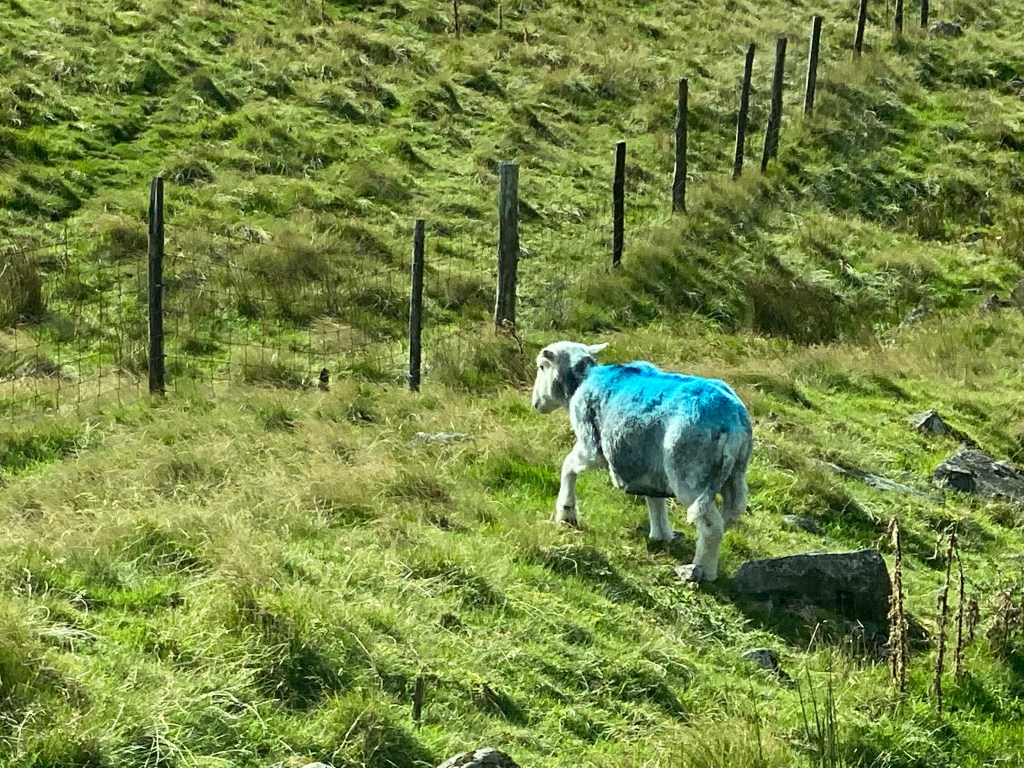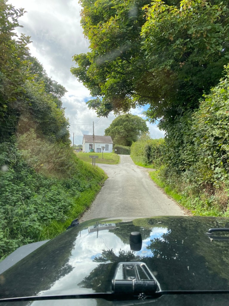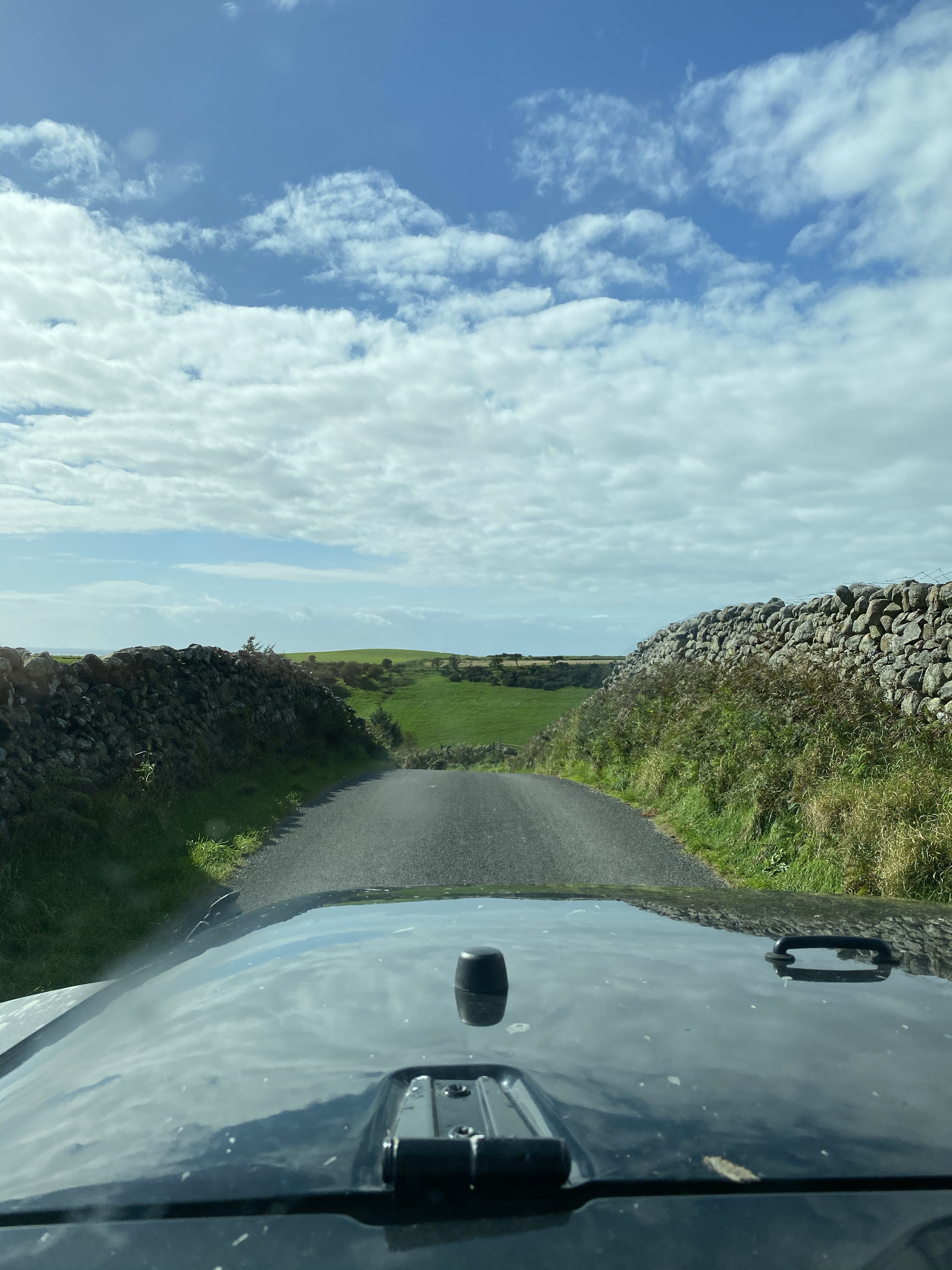Stunning views Still slowly climbing but no one behind us so we can breathe and take it easy Very blue sheep up here! 🐑 💙Finally the brow of the hill! What a view at the other side, right down to the seaZoomed in Beautiful Ooooh memories of Saturday’s scary lane! Cool tree huh?! Back on a “big” road. Just arrived in Ravenglass Jeepey posing
