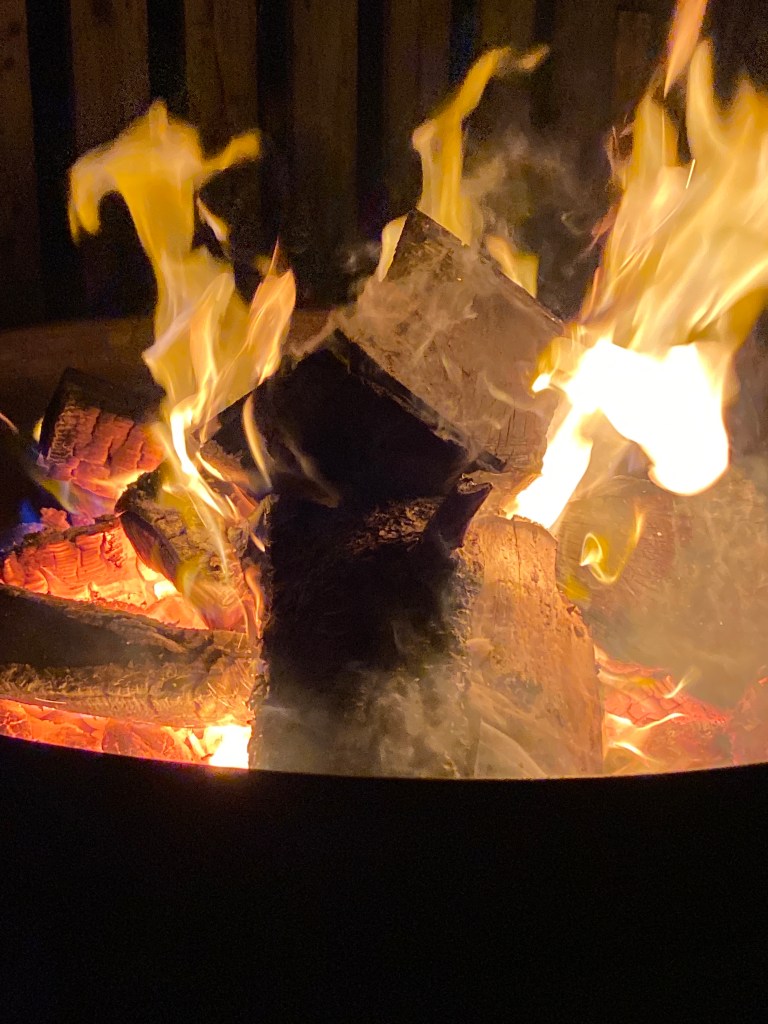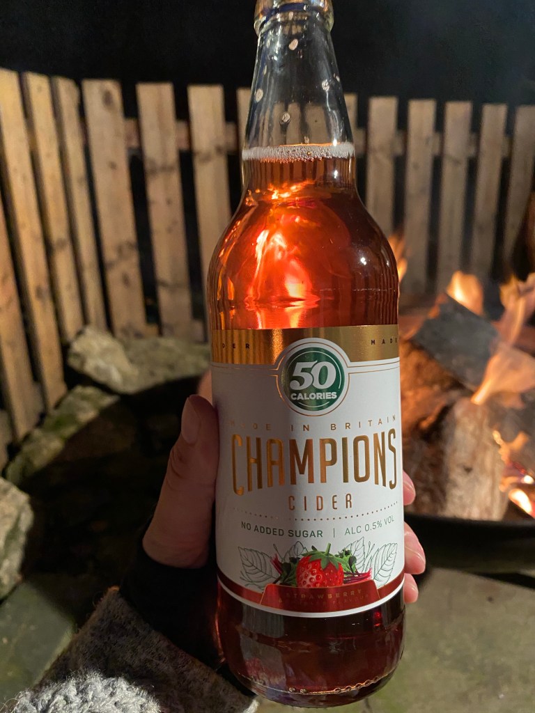 Finally we’re outside now at the fire pit. I have a lovely alcohol free cider that I picked up in Tesco today. It’s only 50 calories and is super tasty!