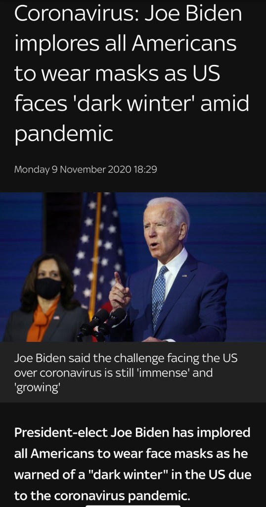 In other good news the president-elect Joe Biden has finally been able to announce that wearing masks in the US should not be a political statement. This is great for the States as it will stop the spread of the virus.