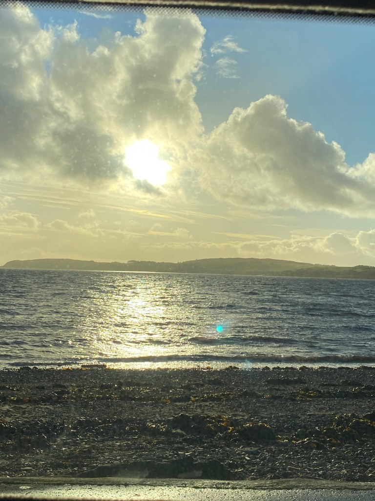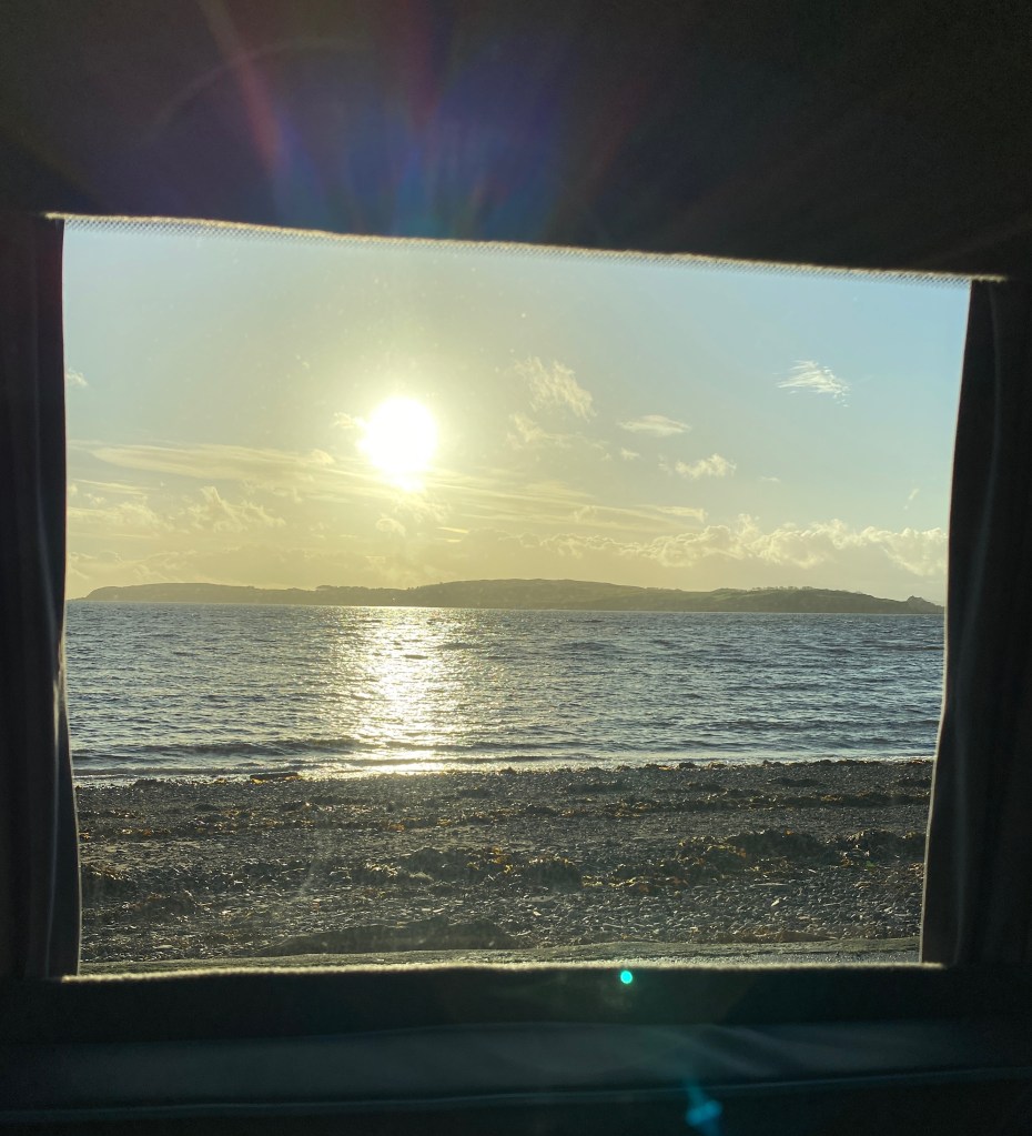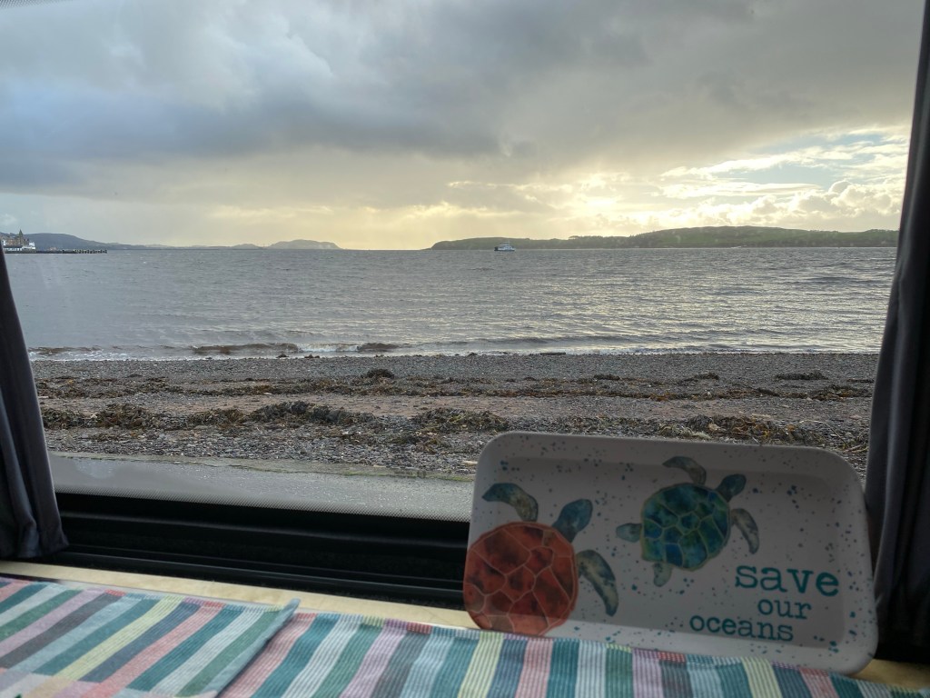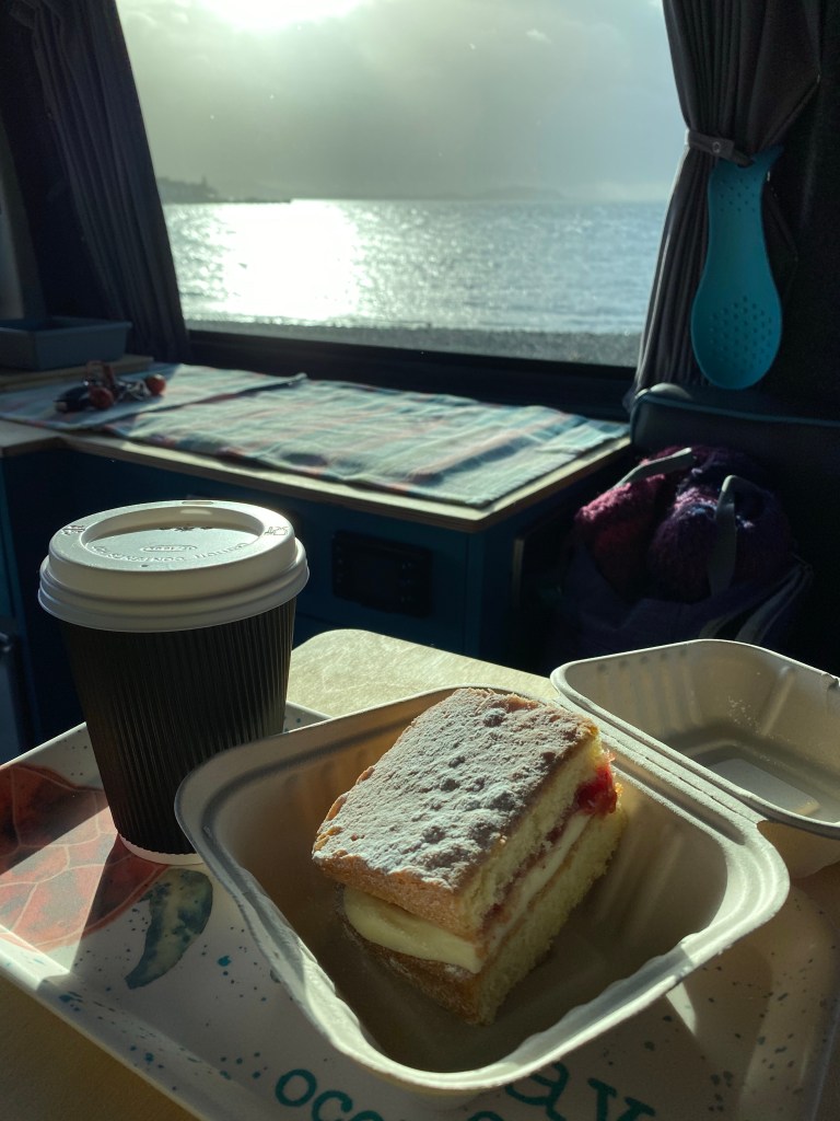 Here I am in Abbie the campervan in Largs, appreciating stillness. I’ve had a Little Coffee Caravan oat latte and a large bit of Victoria Sponge.