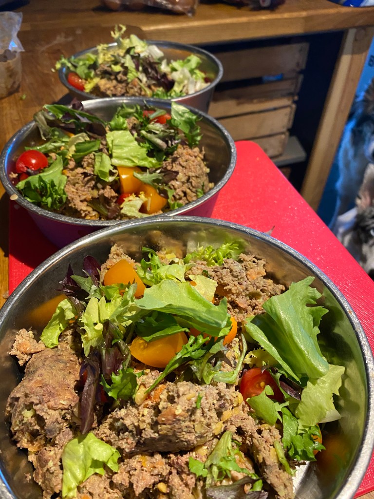 Now we feed our dogs a very healthy diet as it is but we cut open the packets of human grade cooked food and serve it twice a day. We don’t change variety often enough.