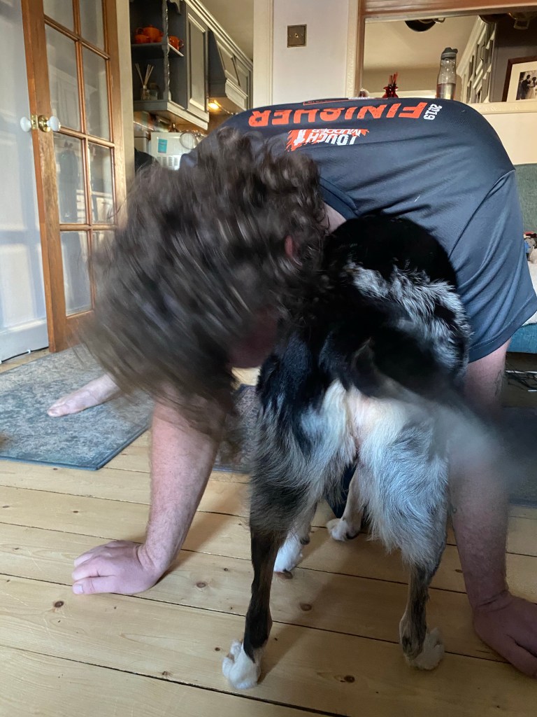 We did a good almost hours’ worth of proper stretching today. We have both seized up a bit, me more so than him but it was good to get a proper trainer-led stretch done. Despite the furry interruptions!
