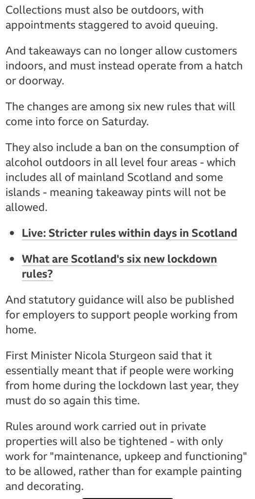 So there was another Scottish lockdown announcement today with tighter restrictions to try and stop the virus from spreading further…. 6 new rules.