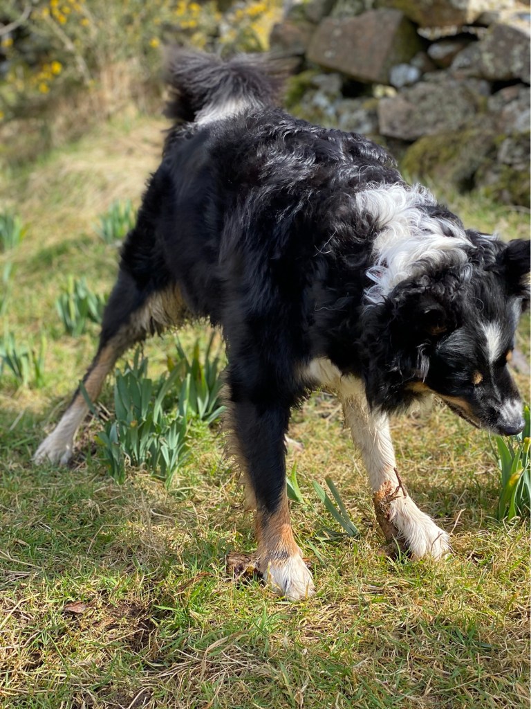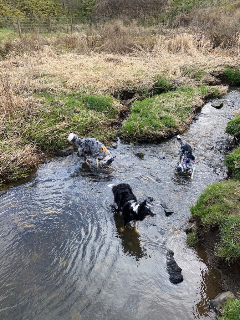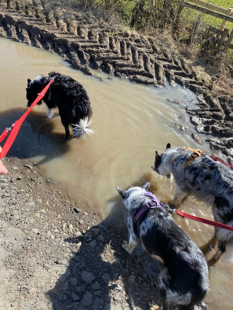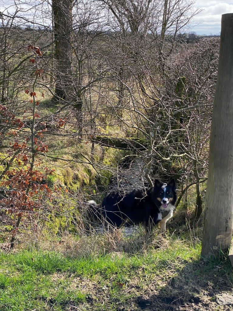 Don’t be fooled…. very windy and very cold! Still very beautiful 🤩 Almost 🌼🌼🌼THE gate with a lovely blue sky Walk on hold while Craig hunts the poo to be picked up 🧐Keek!!!! Washing our paws 🐾🐾🐾The reflective puddle is back Here she is…. coming to see where we all are and enjoying the sun.