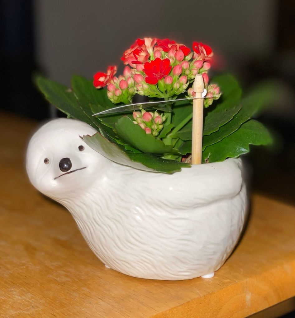 Check this wee guy! Claire bought me it for the office! It is a sloth holding flowers in its tummy but I also see a dove with flowers on its back! 🌸