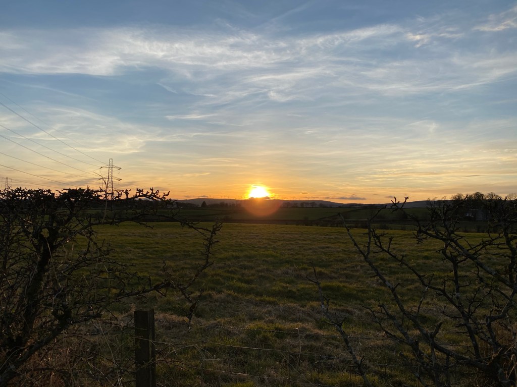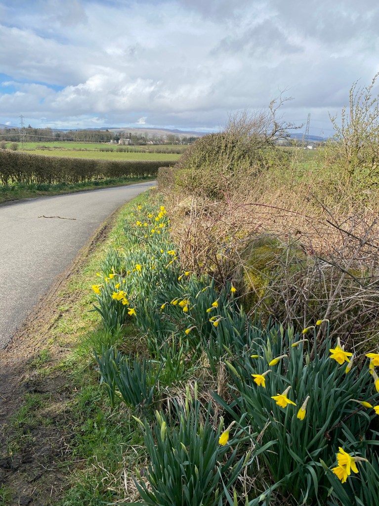 Very strange cloud pattern over Beith – tornado?!? Thankfully not. The sun was shining on this gate today Hard work getting a photo of Freya standing up as she always lies down…. I got the phone ready and turned would with a ta-dah got you!! Freya in her usual photo pose! Lovely evening sun Daffies blooming!