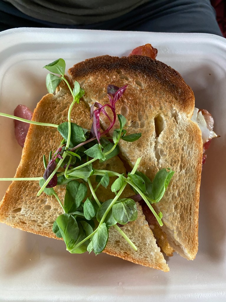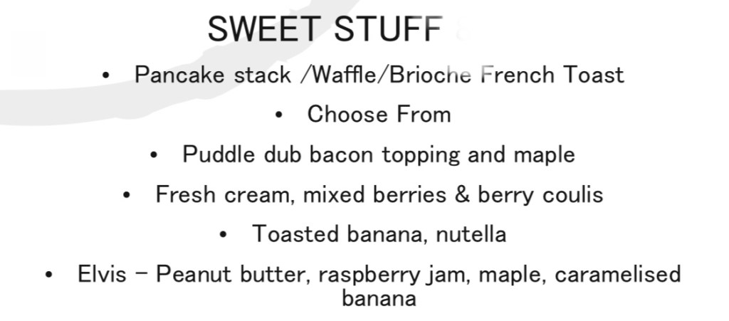 Waiting on the food in the camper Sausage, bacon and egg toasted sandwich 🥪 An Elvis waffle stack… out of this world!!!Death by breakfast!!! the stuff on the top is candy floss… of course… there wasn’t enough sugar in there already.