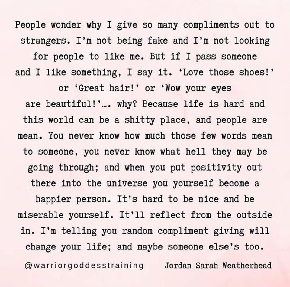 Keep being kind to others, keep smiling and keep giving out ransoms compliments and the world and you will be all the better for it.