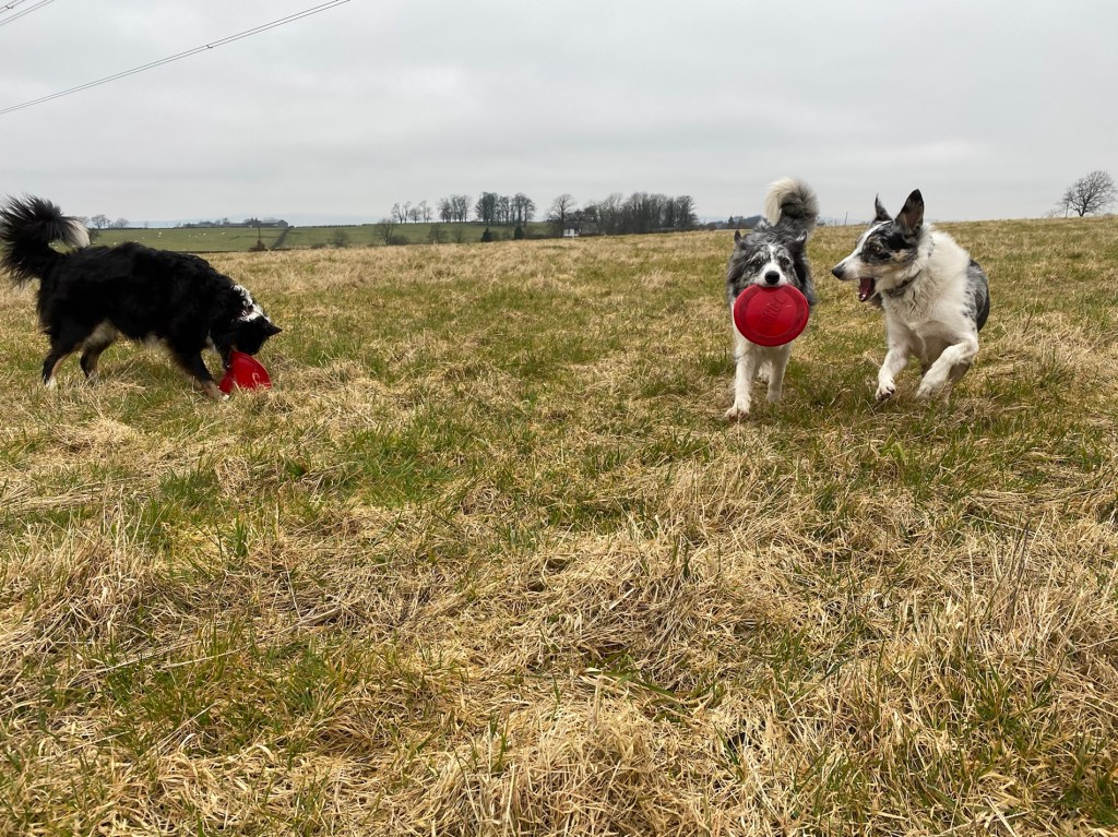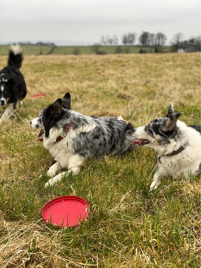 I tried to get pics of them actually catching the frisbee hitch is surprisingly hard work when you throw and snap photo from the same hand!!Calaidh has a frisbee all to herself as she’s not great with sharing… she always wants the one the others have tho! Here she comes…. Calaidh did steal the frisbee right from under their noses!! Snaffled!!I have the biggest tongue! This is such a sweet photo! Me and my sister ♥️Last one I promise…. I need fillers on a day where I do precious little else 🤣🤣