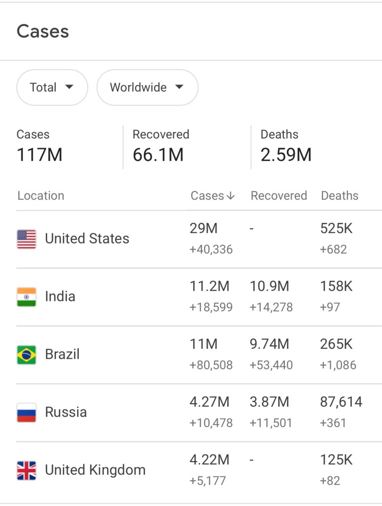 2.59 million people in the world have died from COVID-19 so far. 11.7million cases have been reported.
