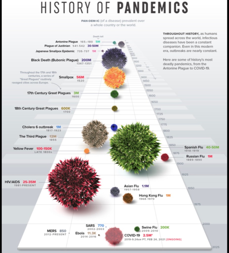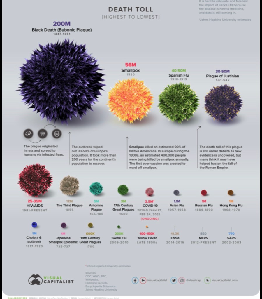 You have to zoom in on this graphic and it’s a bit blurry but the COVID-19 ball at the bottom is now way bigger than the recent pandemics yet still goes a long way before it competes with HIV/AIDS.