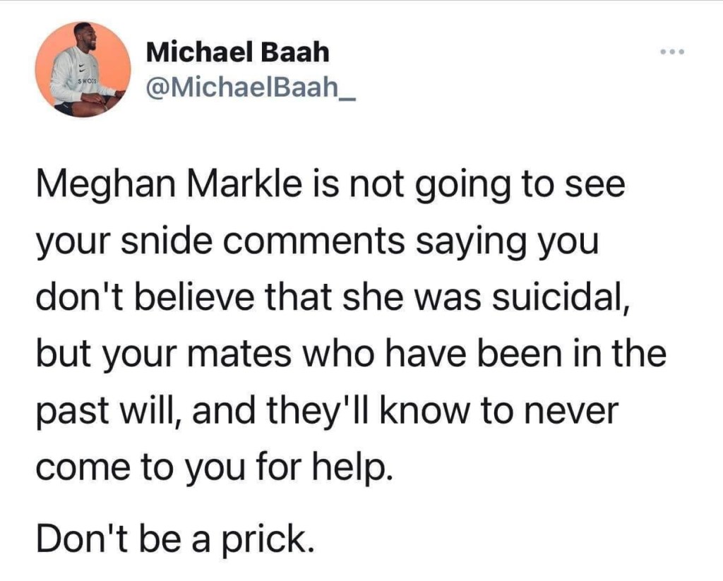 Meghan does not follow social media and god love her as I think she’s right to do that. For some reason she can’t do right for people thinking she’s doing wrong. So I choose to take the interview last night at face value. She did not want to live anymore. She felt so bad she thought the world would be better off without her.