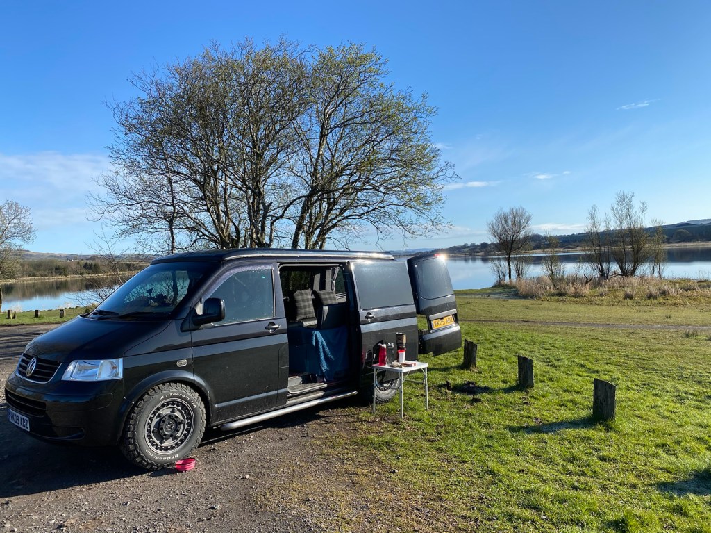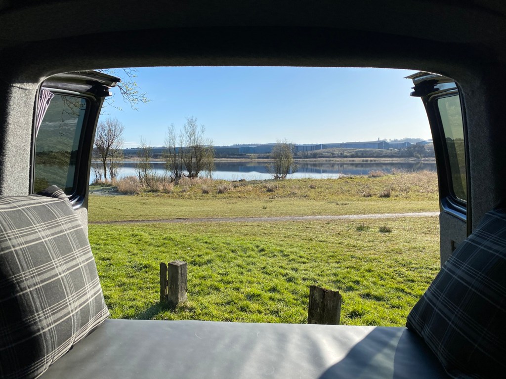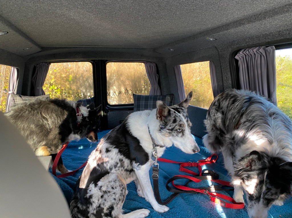 Here we all are in the van ready to go somewhere nice to let the dogs have a big run, it’s not the best photo…. I’d made the bed up with a blanket on it to keep the van reasonably clean.