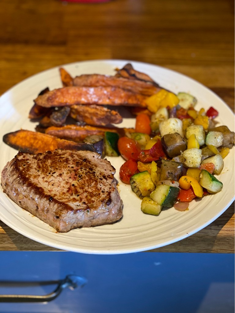 So we had the fillet steak 🥩 with sweet potato wedges and Mediterranean veg.