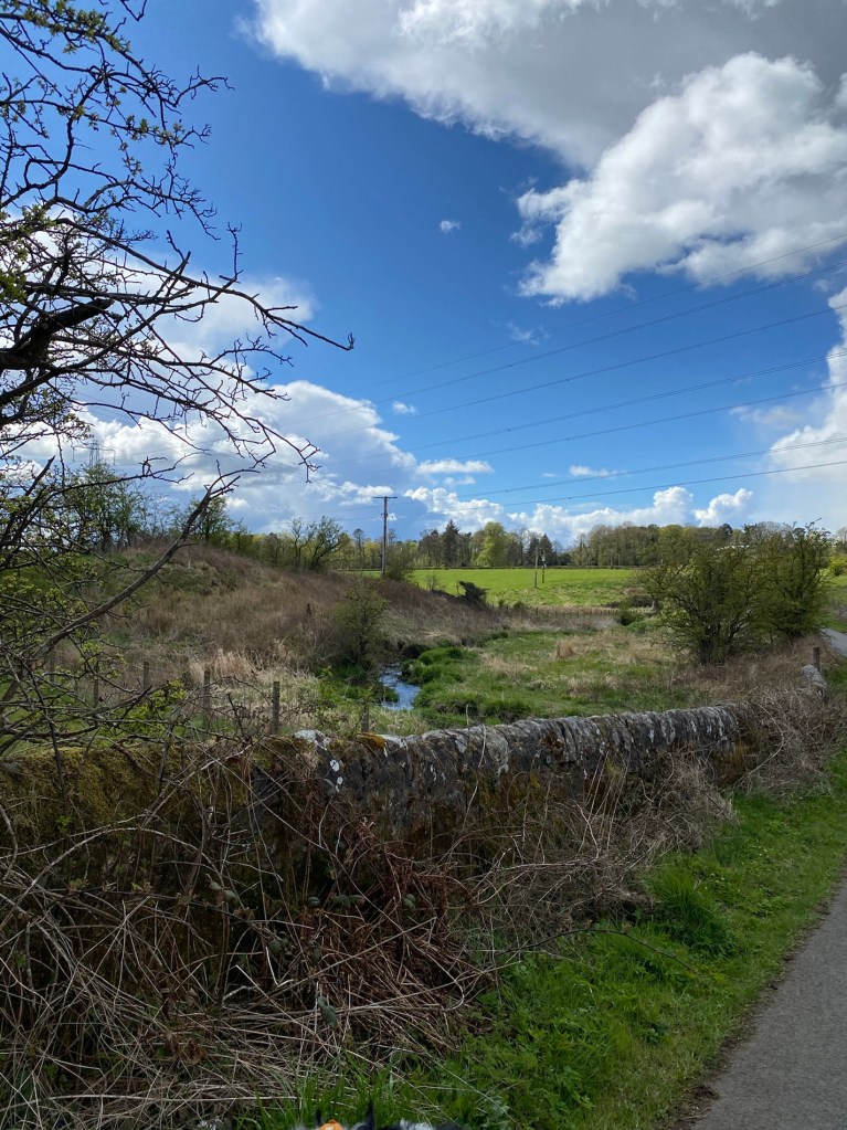 💚💚💚This lovely blossom is growing on the hedges The gorse is all in full bloom 💛💛💛 again the dark blue sky 🌌 Our village dog walking group (aptly named Dug Walk) gave names to these trees…. Treesa, Twiggy and Oakley. Sadly Oakley seems to have died in the last few years. Still look at them and smile and remember standing there trying to name them!!The sky is very grey todayThis gate is on its last legs and since I’ve lived here, Andy the Farmer had never used it! He is now. Must ask him what he’s up to!?? This is a very run down drystane dyke And a much more together one which goes round the side of our village hall The wall at the front of the village hall used to have wrought iron fencing. Most of this was used in the war so is no longer thereI’ve always loved this wee burn. It’s been dry for ages but fresh water now… we’ll probably not as it’s likely mixed with cow pee but let’s not dwell on that?!?
