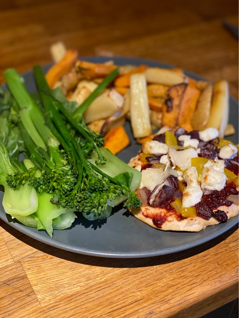 Butterfly chicken pizza with onions, peppers and goats cheese, with parsnip and sweet potato fries with Pak Choi 🥬 and broccoli 🥦. It tasted so good.