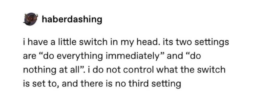 All he said today was to pick one of them and focus on that. One thing out of a list of 14….. tantrum child could give you a million reasons why she can’t do any of them…. But I will pick one thing. Soon. Not sure quite when…. 🤦🏻♀️😆