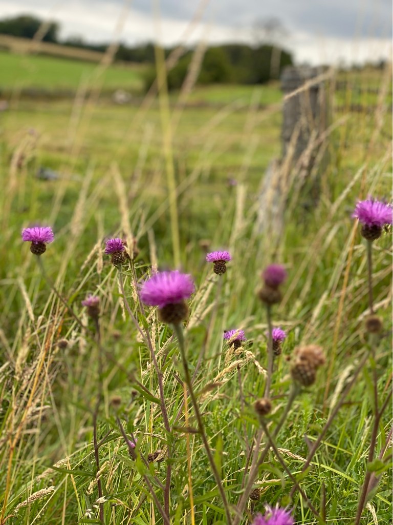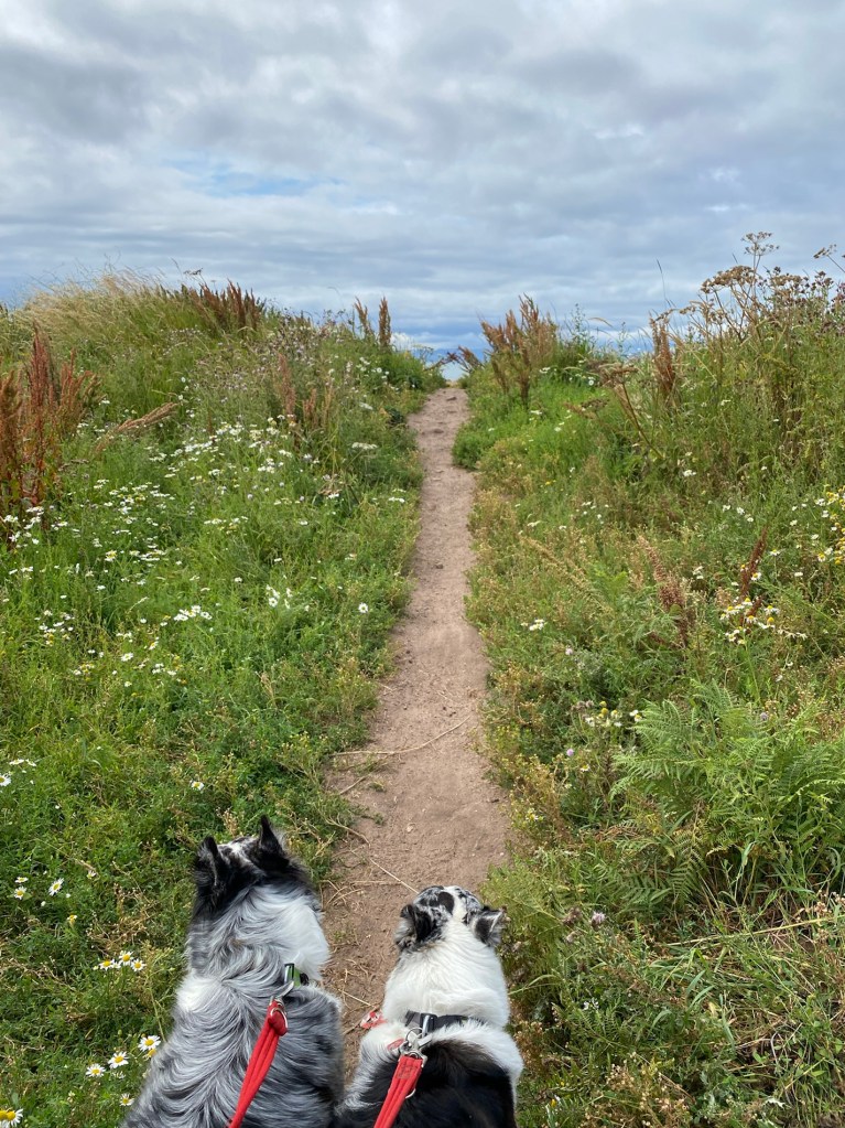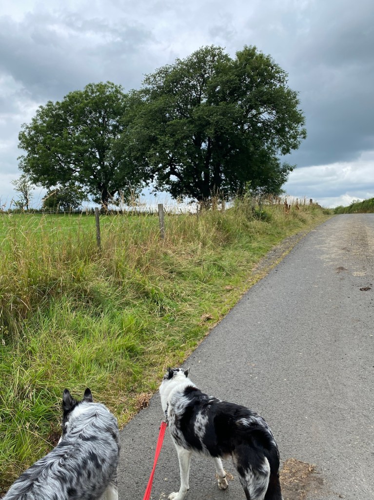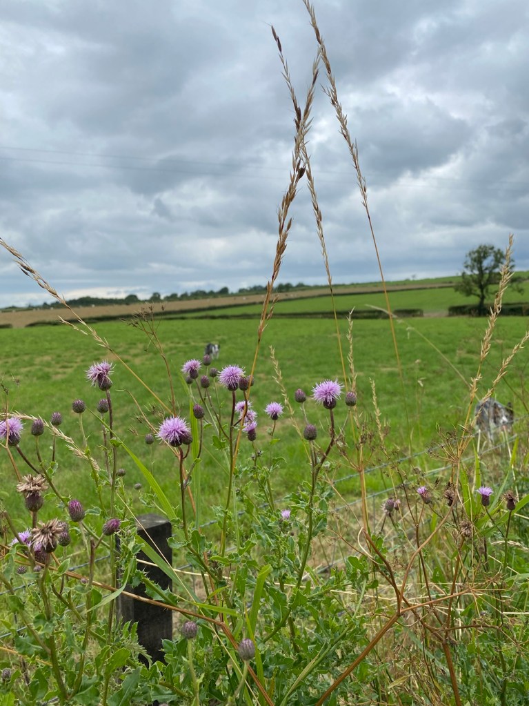 Poor Calaidh pupper has a sore leg… Craig told me it was the white one as I am not good with my right and left. I think this pic says… it’s sore mumma… Muddy track today! Lots of thistle! And a 🐝 Spot the puppers 🐶🐶Different types of thistle Ever get the feeling you are being watched?!? 👀👀👀👀👀So many cows in this field!! The farm near us has a lovely wee urn of flowers that I’ve not noticed before Some very dead thistles (why is there no thistle emoji?!?) Lovely hanging baskets A sea of giant daisies! Dark clouds threatening rain the whole way
