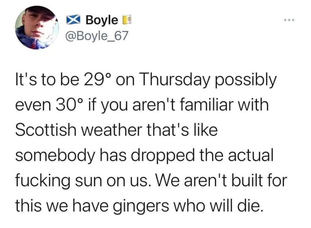 I’m not sure I remember such a consistent run of hot weather in Scotland. Maybe the last time was summer 2018 when we had a heat wave. A few days that I’ve left work today the car has read 35C. I know it’s not but it sure as hell is inside the van!