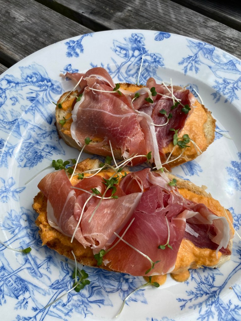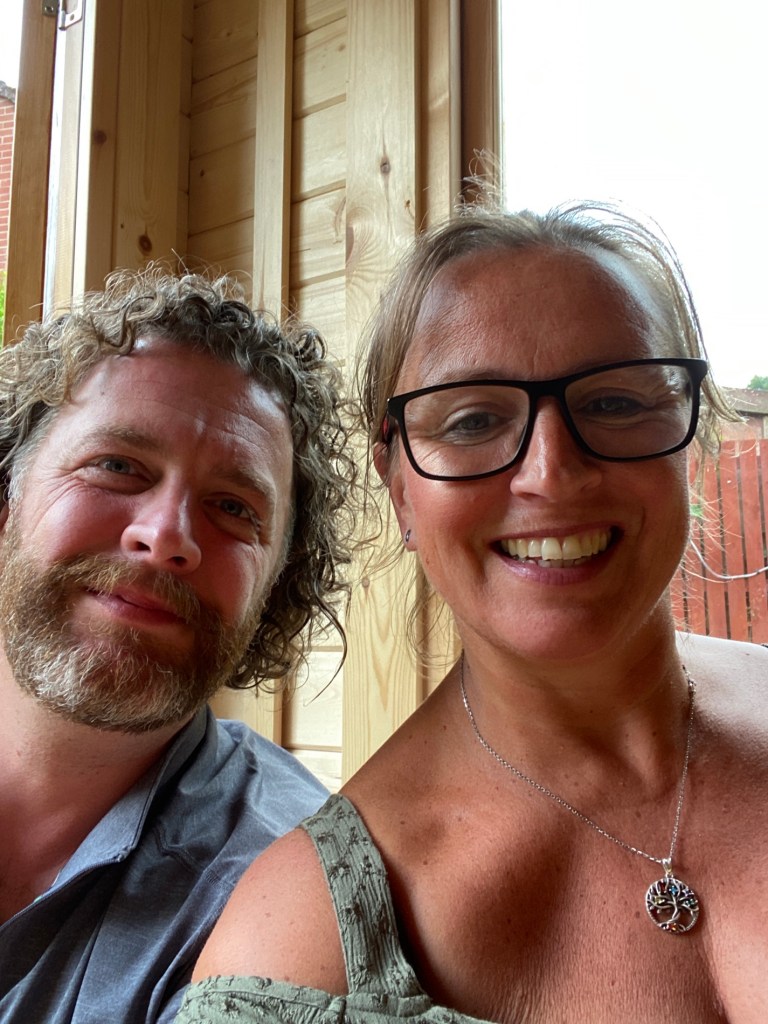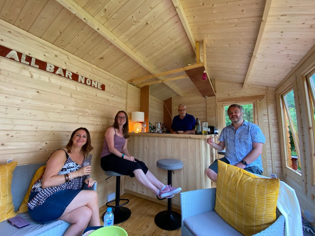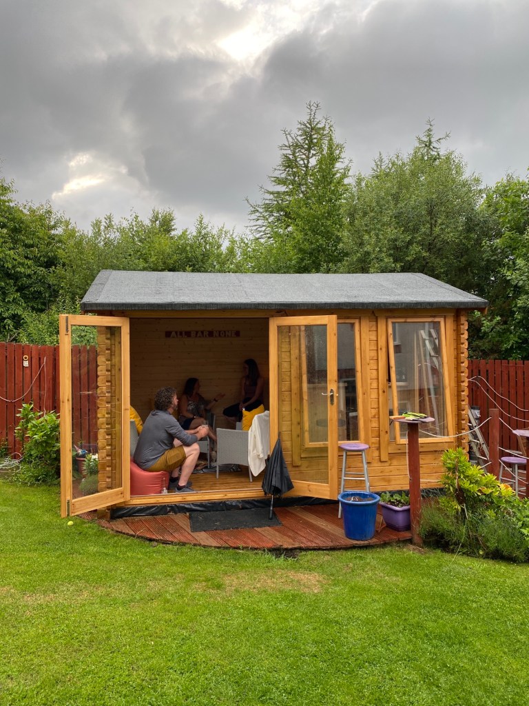Helen and Doug have built the loveliest summer house in the garden so we are all congregated out there as the heavens opened. It’s still warm.