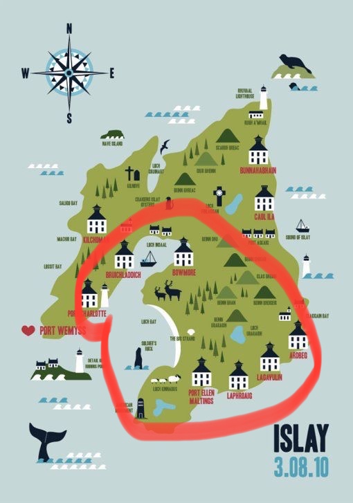 Today’s travels…. Port Charlotte to Bruichladdich to Bridgend to Bowmore to Port Ellen to Lagavulin and back.