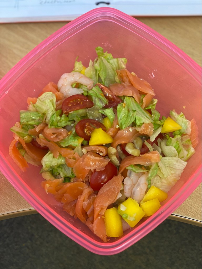 Lunch was smoked salmon and prawn salad with mango, cashews and tomatoes, drizzled with olive oil and lime dressing. All freshly made.