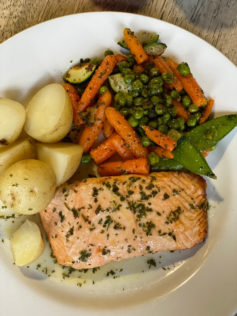 So we popped into the village pub next door and had the healthiest options on the menu. Salt and chilli chicken strips to start and Salmon in lemon and parsley 🍋 🌿 butter for mains.