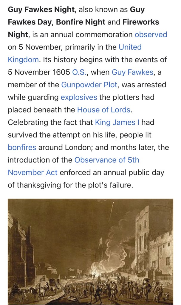 So I should explain for international readers where our Guy Fawkes Day, affectionately known as Bonfire Night comes from.