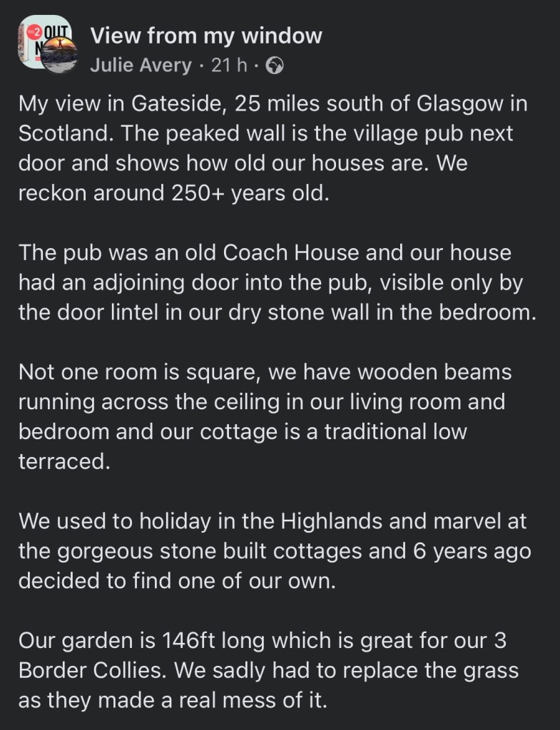So that leads me to this FB post… there’s a page called View from my window. It’s lovely. People post so many stunning views from their houses… from all over the world. Most of them post a wee story about how long they lived there, why they live there or what living there has been like for them.