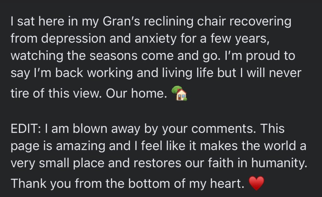 So I thought I’d post a pic from Gran’s chair. Compared to the photos I have seen my view was nothing special but I told them what it meant to me. I currently have 25.8k likes.