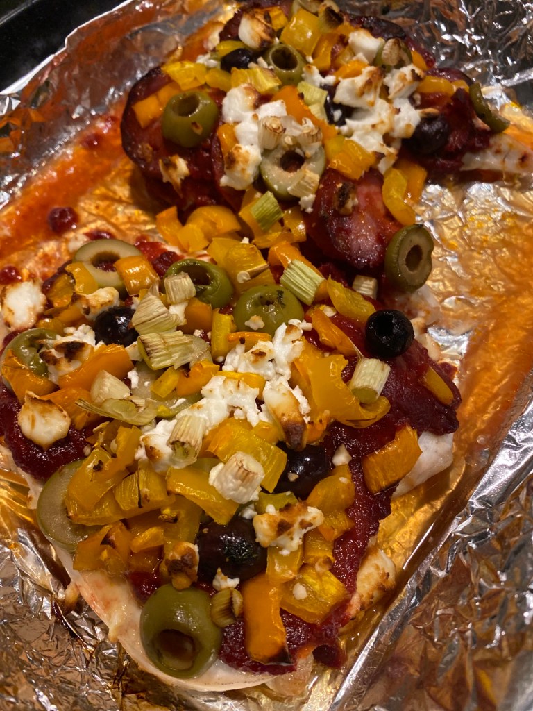 I’m cooking chicken pizza for dinner tonight with olives, peppers, onion and goats cheese. We’re having that with roasted potatoes and broccoli healthy style.