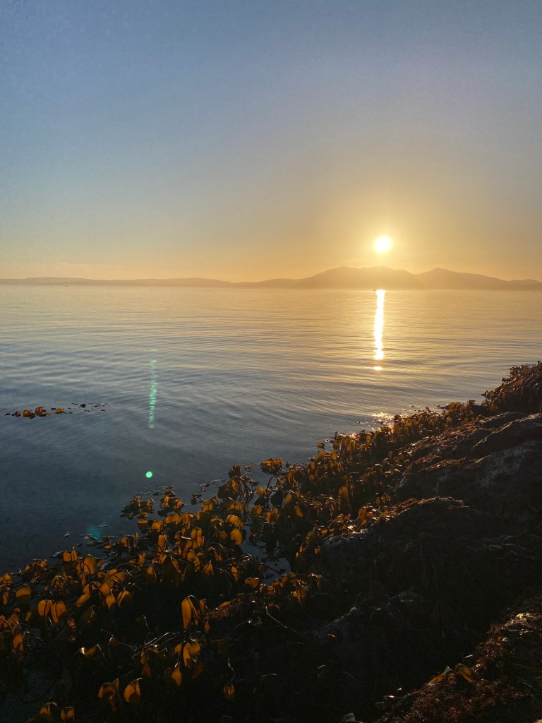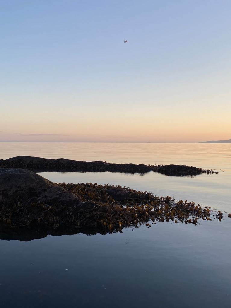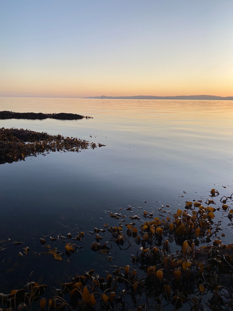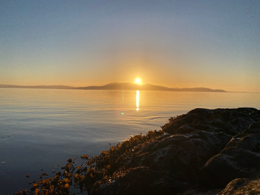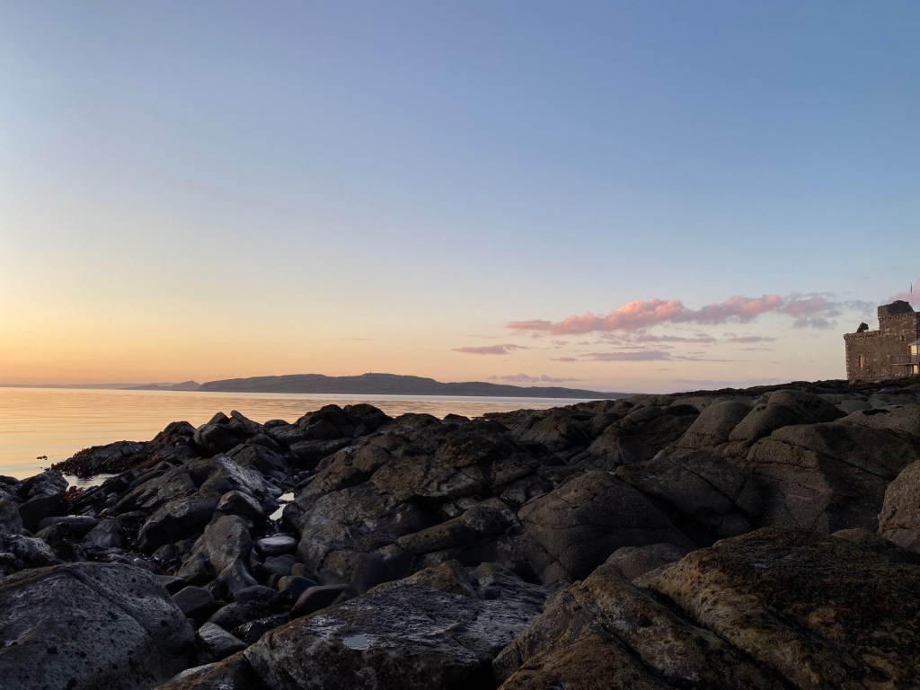 I’m sitting right here. The hustle and bustle of the day far behind me. All I can hear are birds twittering, the sea gently lapping on the rocks, the odd seagull and the low hum of a fishing boat sailing up between Portencross and the Isle of Arran.