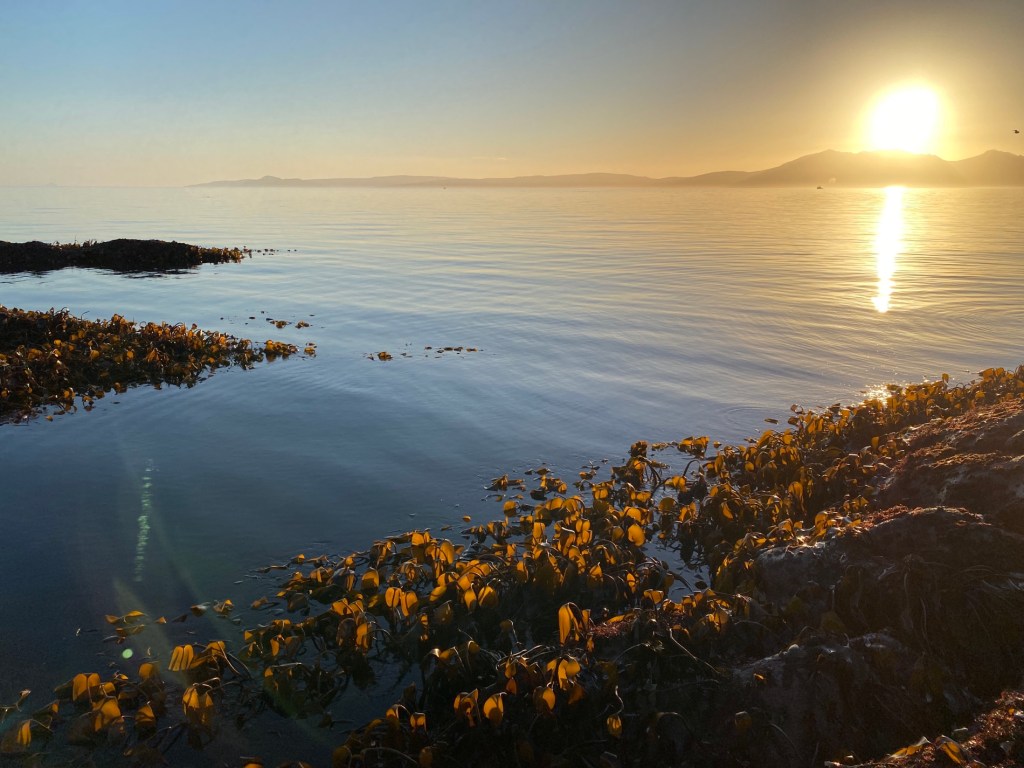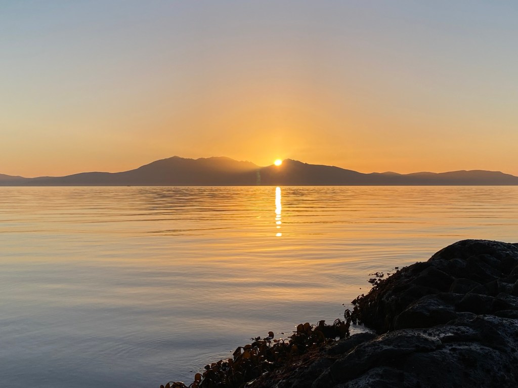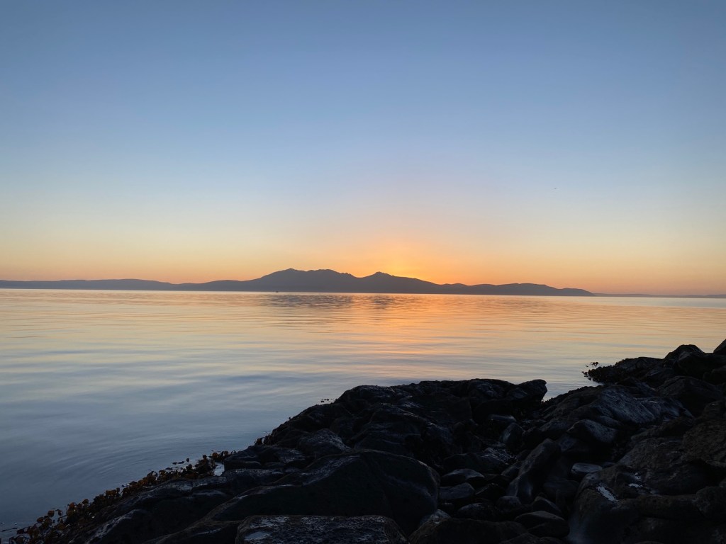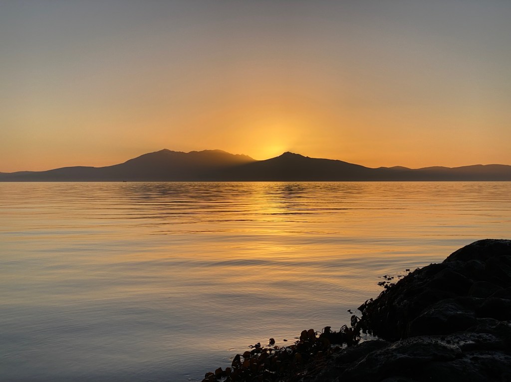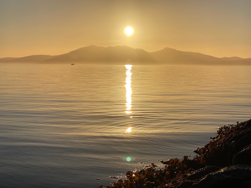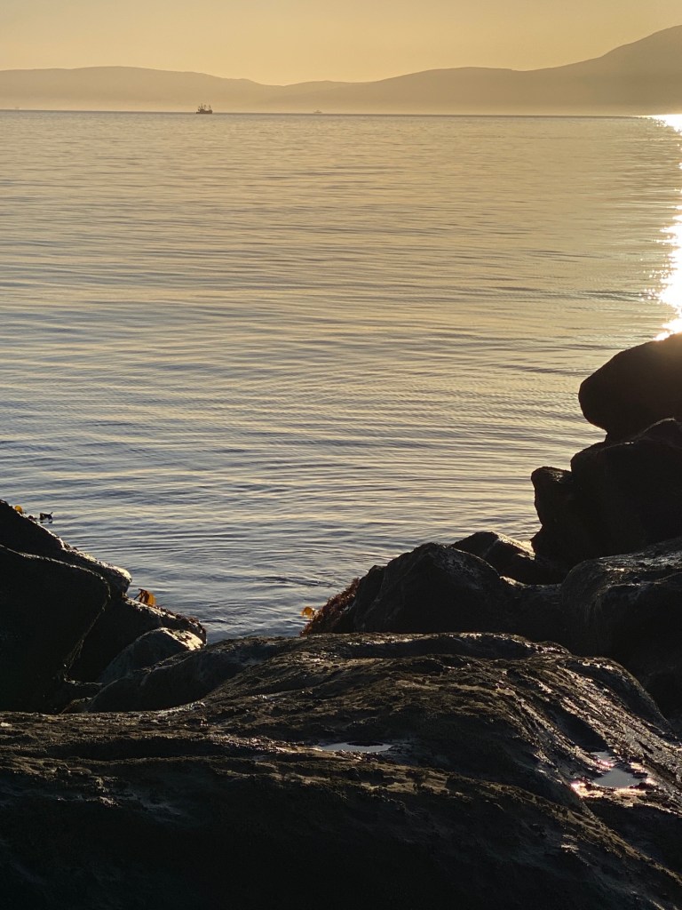 I’m sitting right here. The hustle and bustle of the day far behind me. All I can hear are birds twittering, the sea gently lapping on the rocks, the odd seagull and the low hum of a fishing boat sailing up between Portencross and the Isle of Arran.